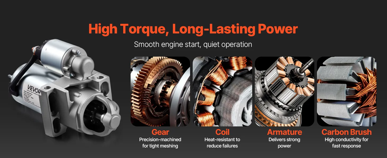 Powerful Performance: The starter replacement features the high-torque armature, high-conductivity carbon brush, and high-temp coil for durability. When energized, it works with the solenoid to deliver strong power, ensuring the engine starts quickly