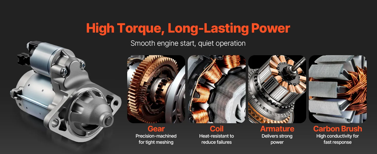 Powerful Performance: The starter replacement features the high-torque armature, high-conductivity carbon brush, and high-temp coil for durability. When energized, it works with the solenoid to deliver strong power, ensuring the engine starts quickly