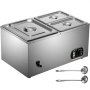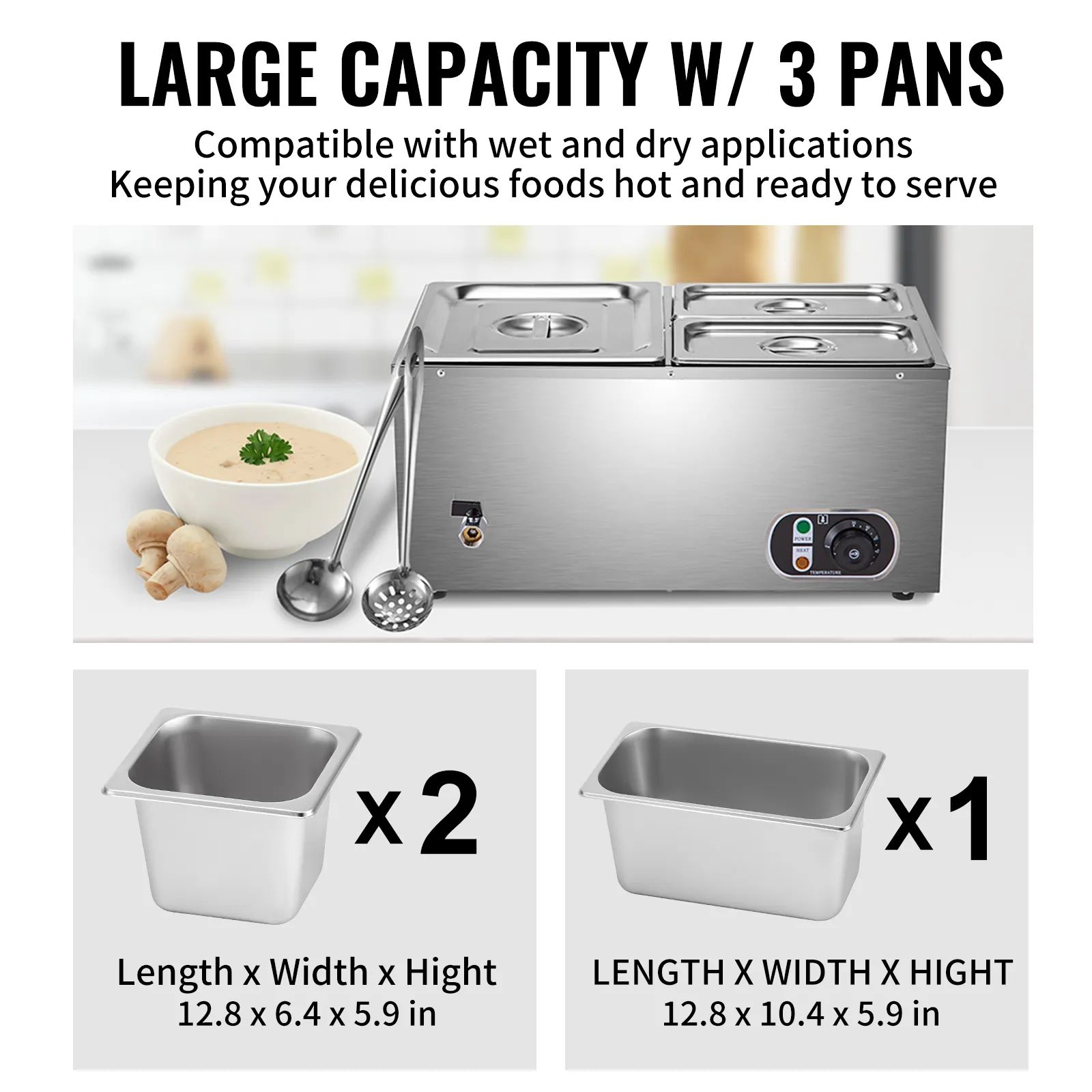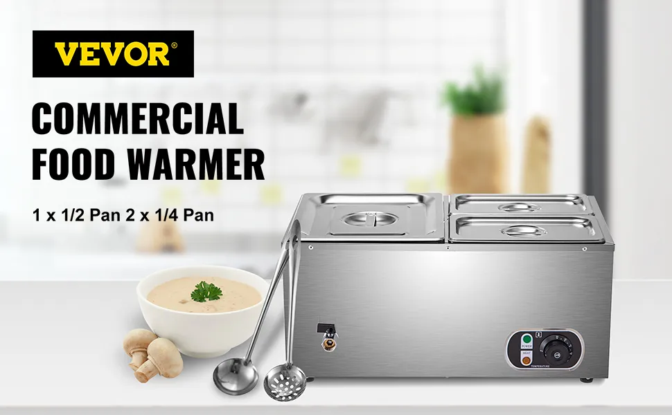 The food warmer comes with a 1/2 pan and two 1/4 pans for large capacity. It is compatible with wet and dry applications, keeping your delicious foods hot and ready to serve.