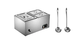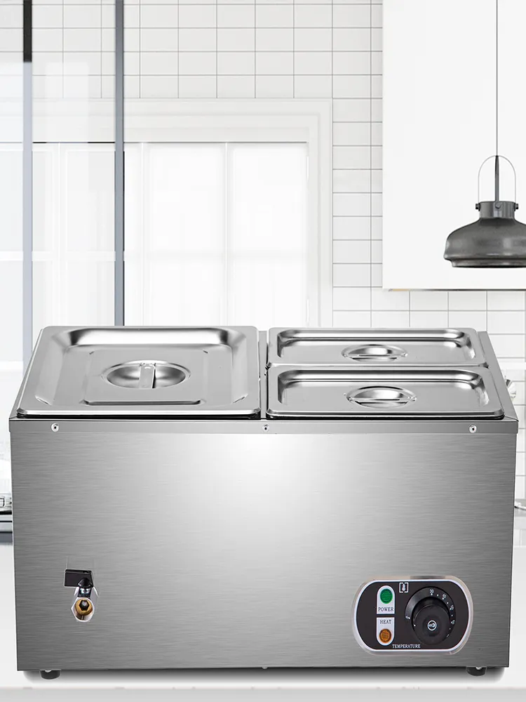 The restaurant food warmer, including three pans and lids, is made of thickened food-grade stainless steel, durable and easy cleaning. Constant temperature control (30-85℃) keeps dishes warm as you wish. The catering food warmers are widely used to keep dishes warm in breakfast shops, snack bars, restaurants, school cafeterias, etc.