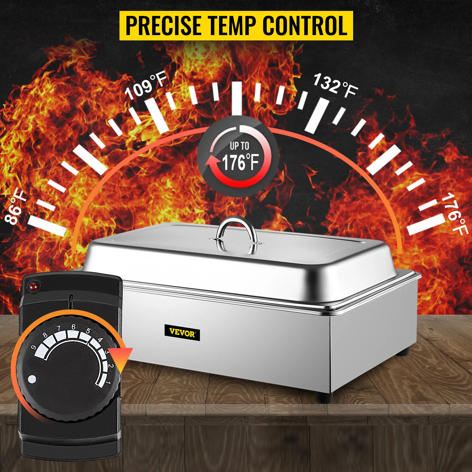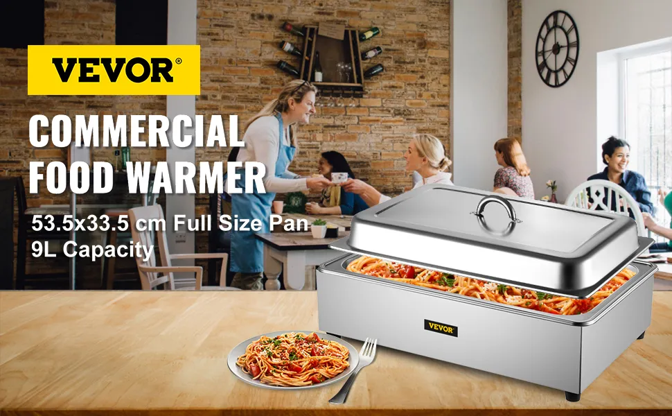 This commercial food warmer has a 9 L / 9.5 Qt capacity pan and can contain a more considerable amount of food at once. It possesses a thermostatic knob in the range of 30℃ / 86℉ to 80℃ / 176℉, ensuring food taste. It is equipped with an efficient heating board for rapid and even heating. This steam table warmer is the best choice for various home and commercial use. VEVOR's food warmer will keep your food hot and ready with no loss in taste.