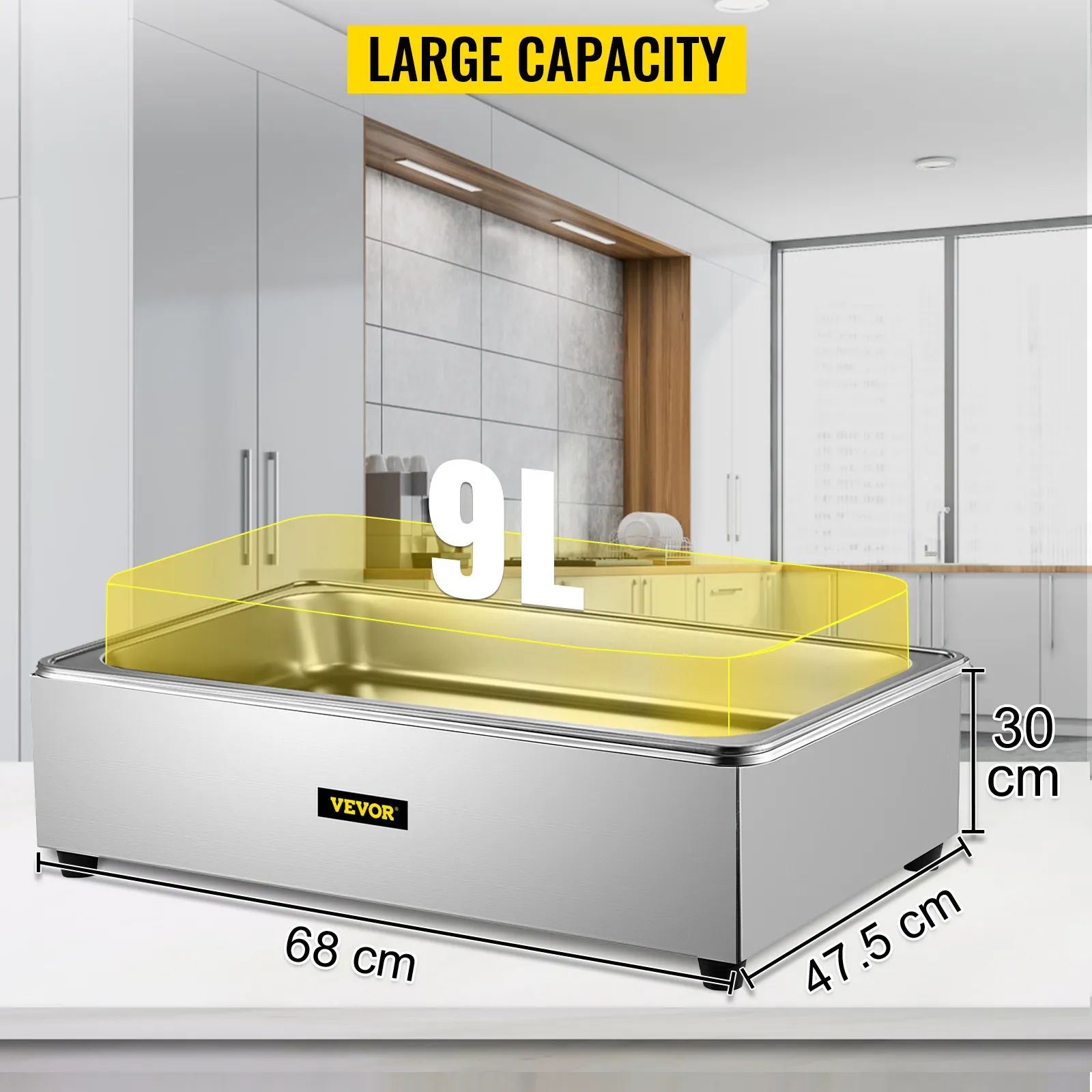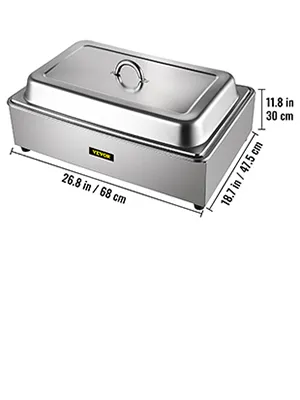 Total size: 68x47.5x30 cm / 26.8x18.7x11.8 inch. Container size: 53.5x33.5x6.5 cm / 21x13.2x2.5 inch. Our buffet server comes with a full-size 9 L / 9.5 Qt capacity pan. It is compatible with wet and dry food, keeping your delicious food hot and ready to serve.