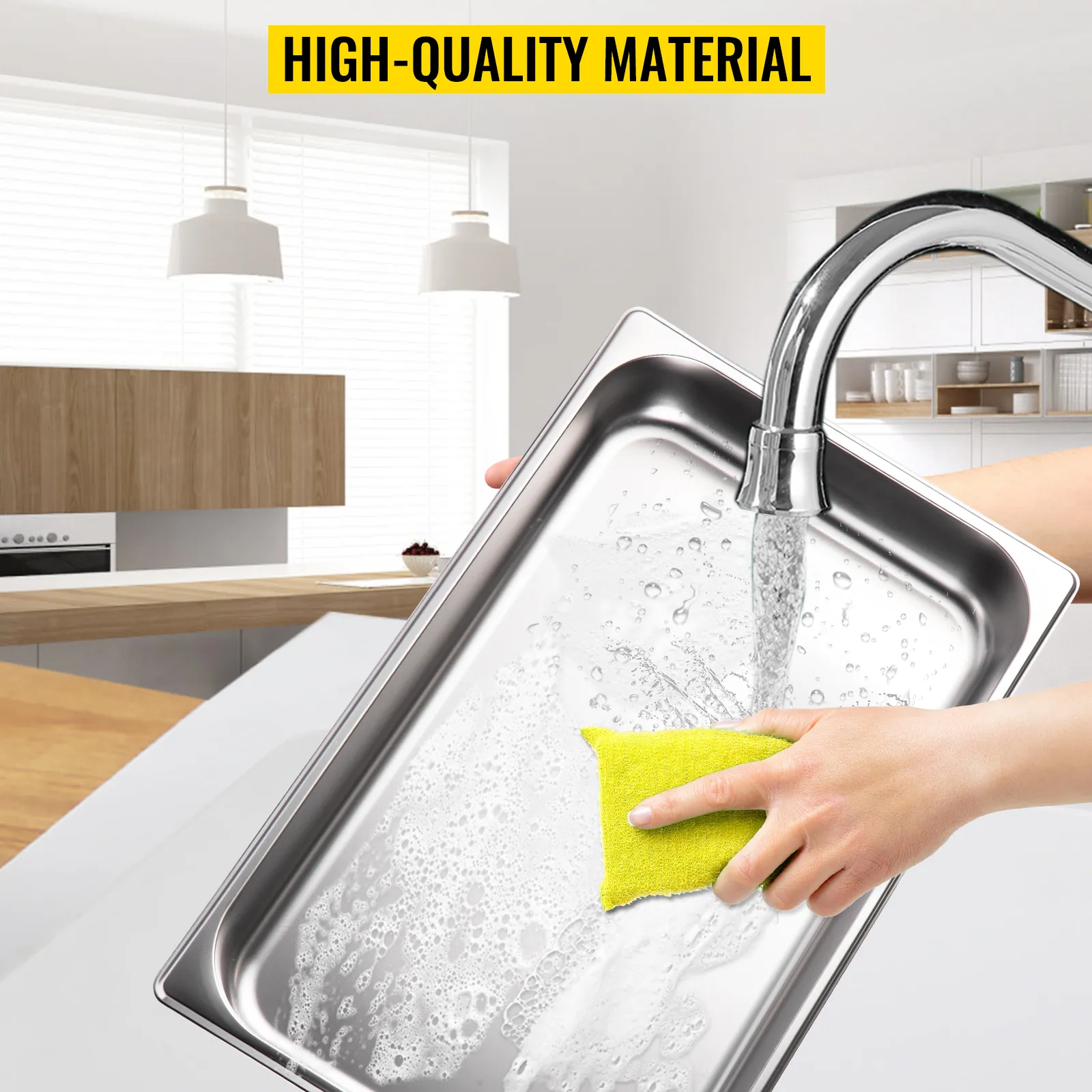 This buffet server and warming tray feature thickened food-grade stainless steel that is solid, durable, and resistant to pressure. It is also easy to clean.