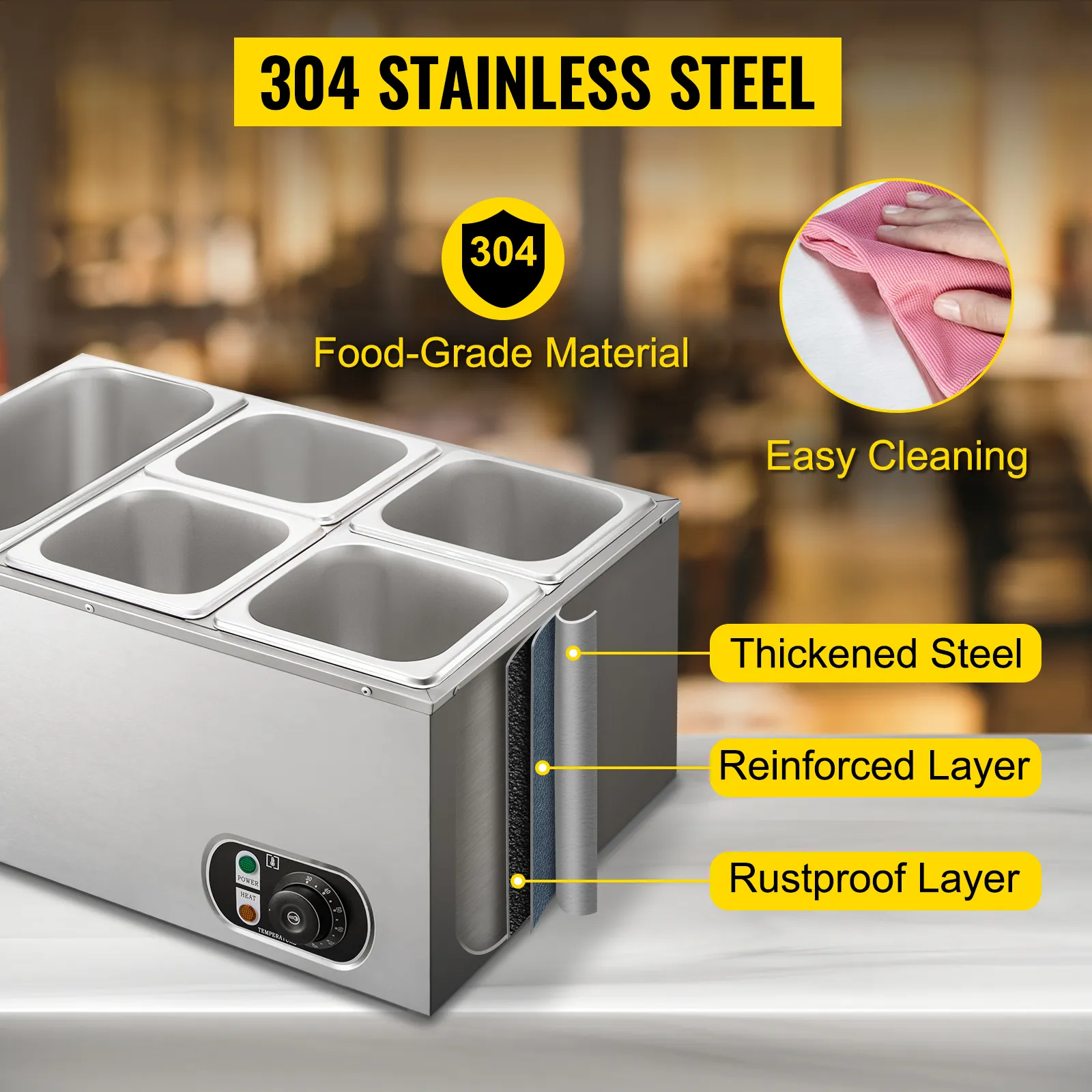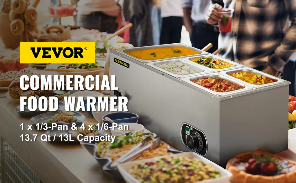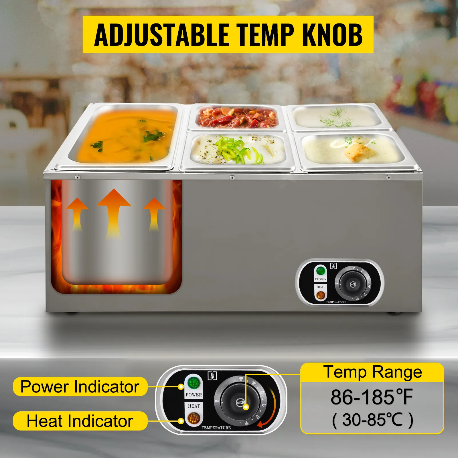 Whether you're serving soup, spaghetti, stew, or oatmeal, this soup warmer commercial is ideal for your buffet, restaurant, or snack bar. The food warmer electric, including five pans and lids, is built with 304 stainless steel, ensuring long-lasting use and easy cleaning. The 13 L capacity allows this electric food warmer buffet to heat more foods at one time. Its adjustable temperature from 30℃ to 85℃ (86℉ to 185℉) keeps dishes warm as you wish.