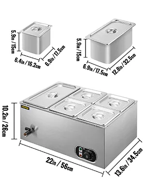 Our commercial food warmer comes with a 1/3 pan and four 1/6 pans for 13 L capacity. It is compatible with wet and dry dishes, keeping your delicious foods hot and ready to serve.