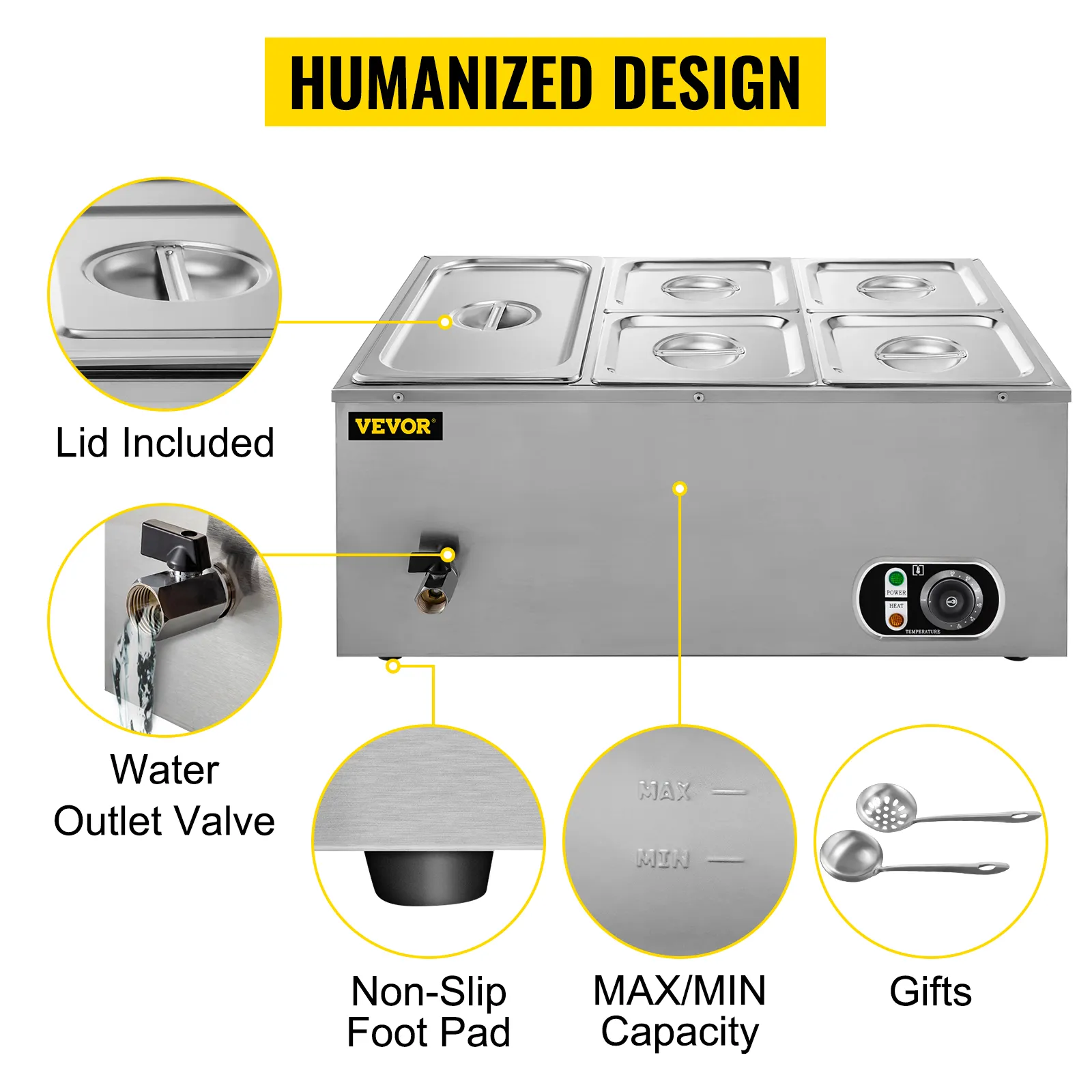 The lid for each pan returns water to the food to retain its original flavor. A water outlet valve is convenient for draining the remaining water in the steam table food warmer. Further, two ladles are available to serve dishes.