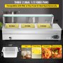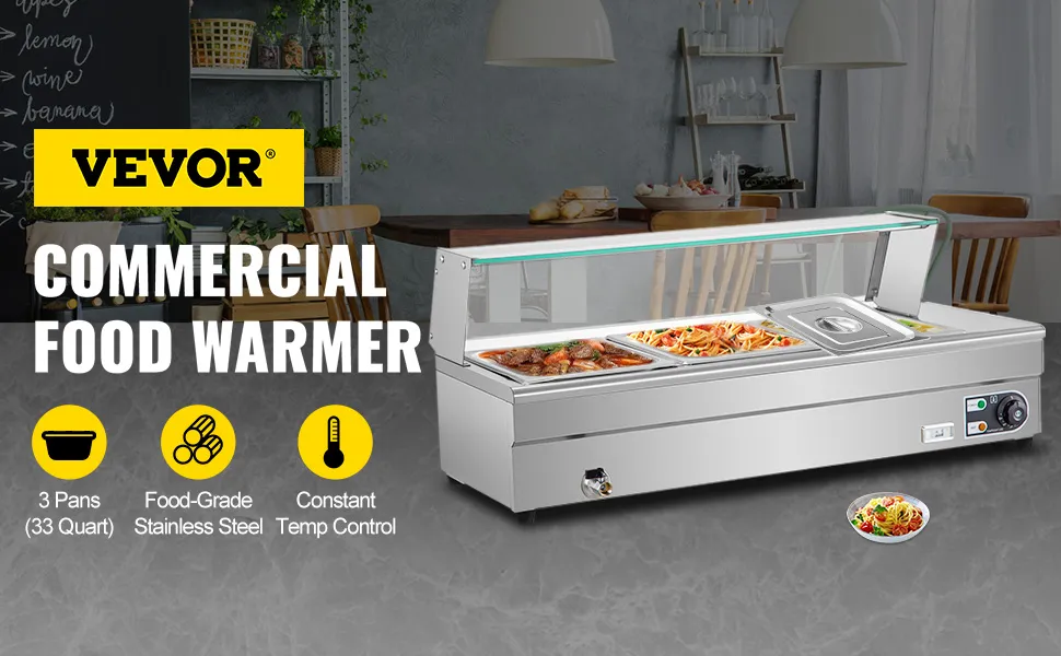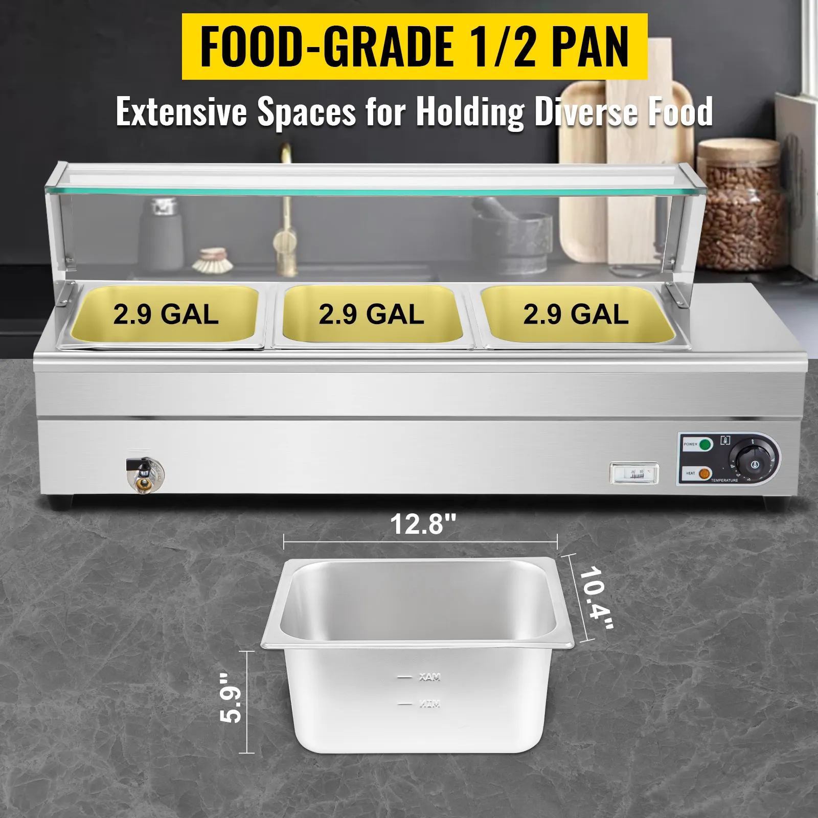 This table top food warmer comes with three removable large-capacity pans, made of food-grade stainless steel. Each pan is 12.8"x10.4"x5.9" (325x265x150 mm)in dimensions, 2" (50mm) deeper than others, obtaining an additional 50% of the capacity.