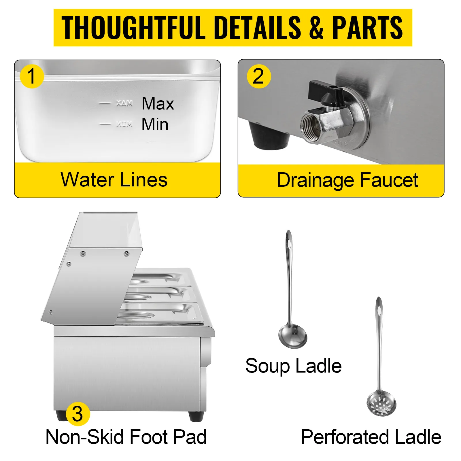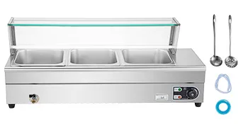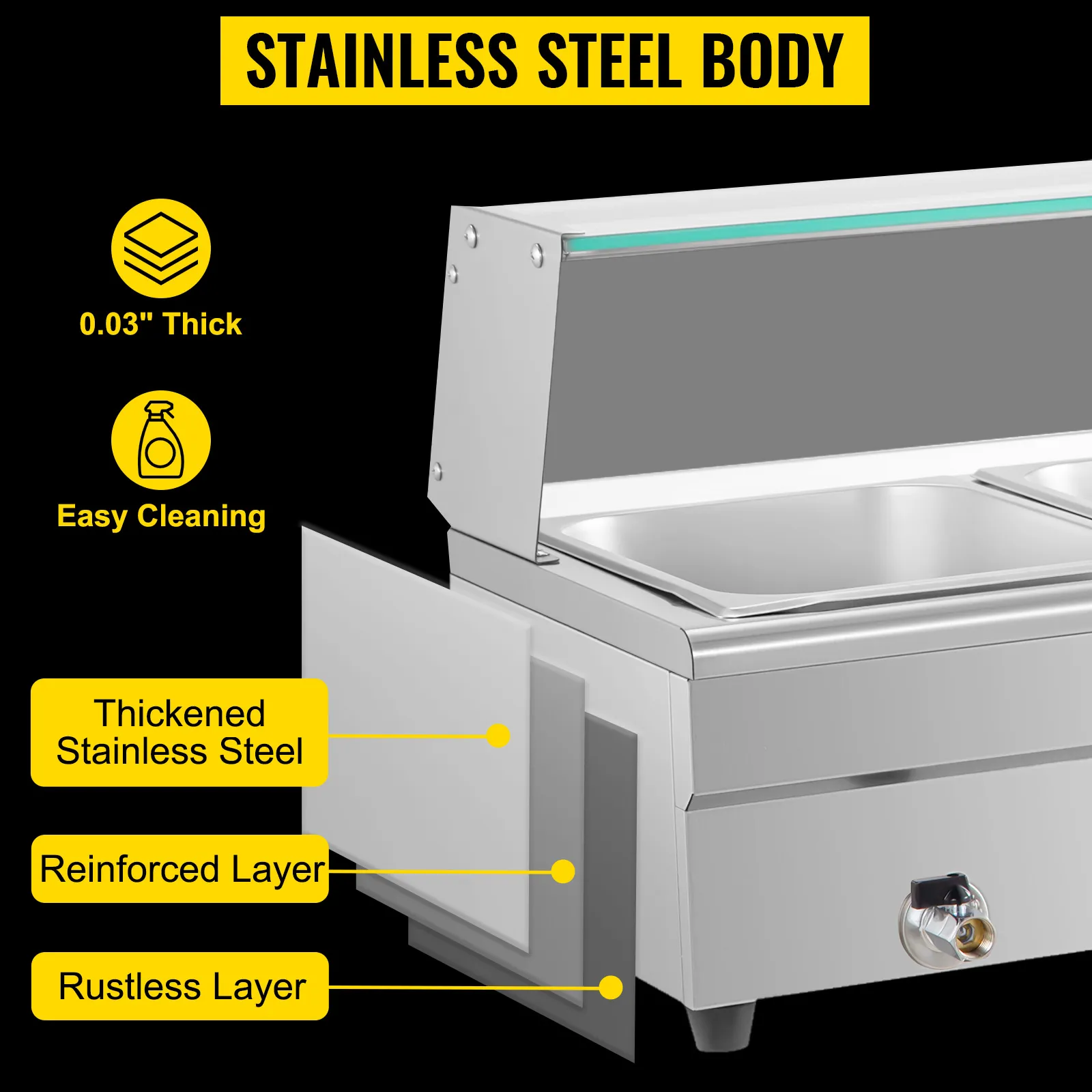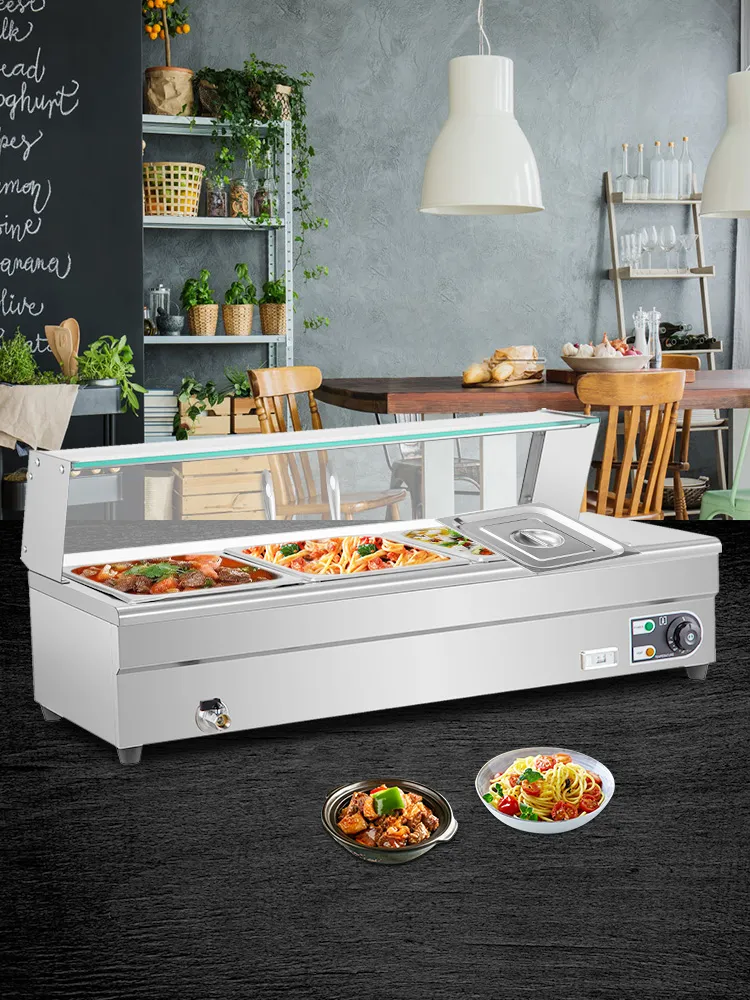 This commercial food warmer is equipped with a drain tap to easily drain excess water. Each food pan is matched with a stainless steel lid to prevent dust from entering the food.