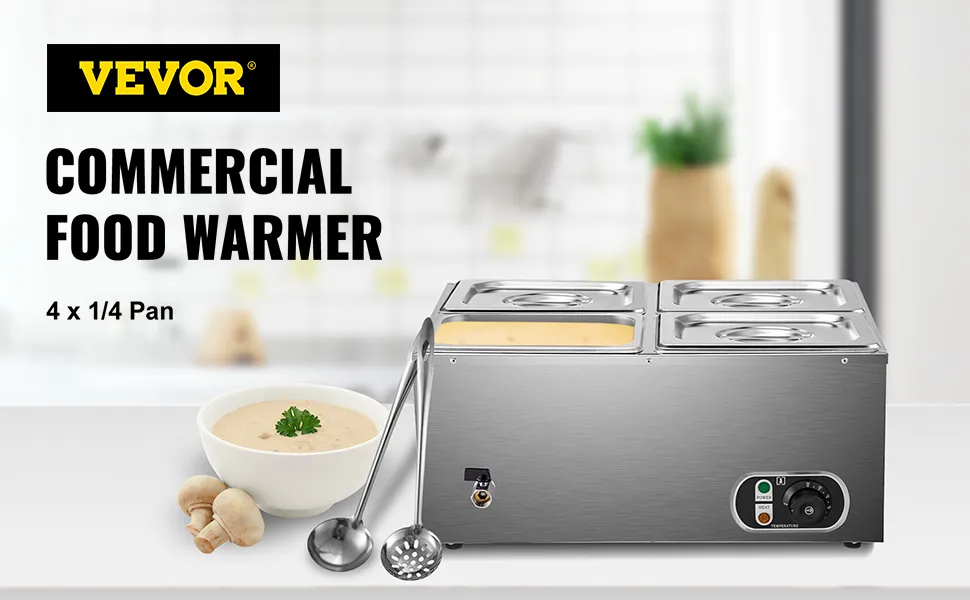 The food warmer comes with four 1/4 pans for large capacity. It is compatible with wet and dry applications, keeping your delicious foods hot and ready to serve.