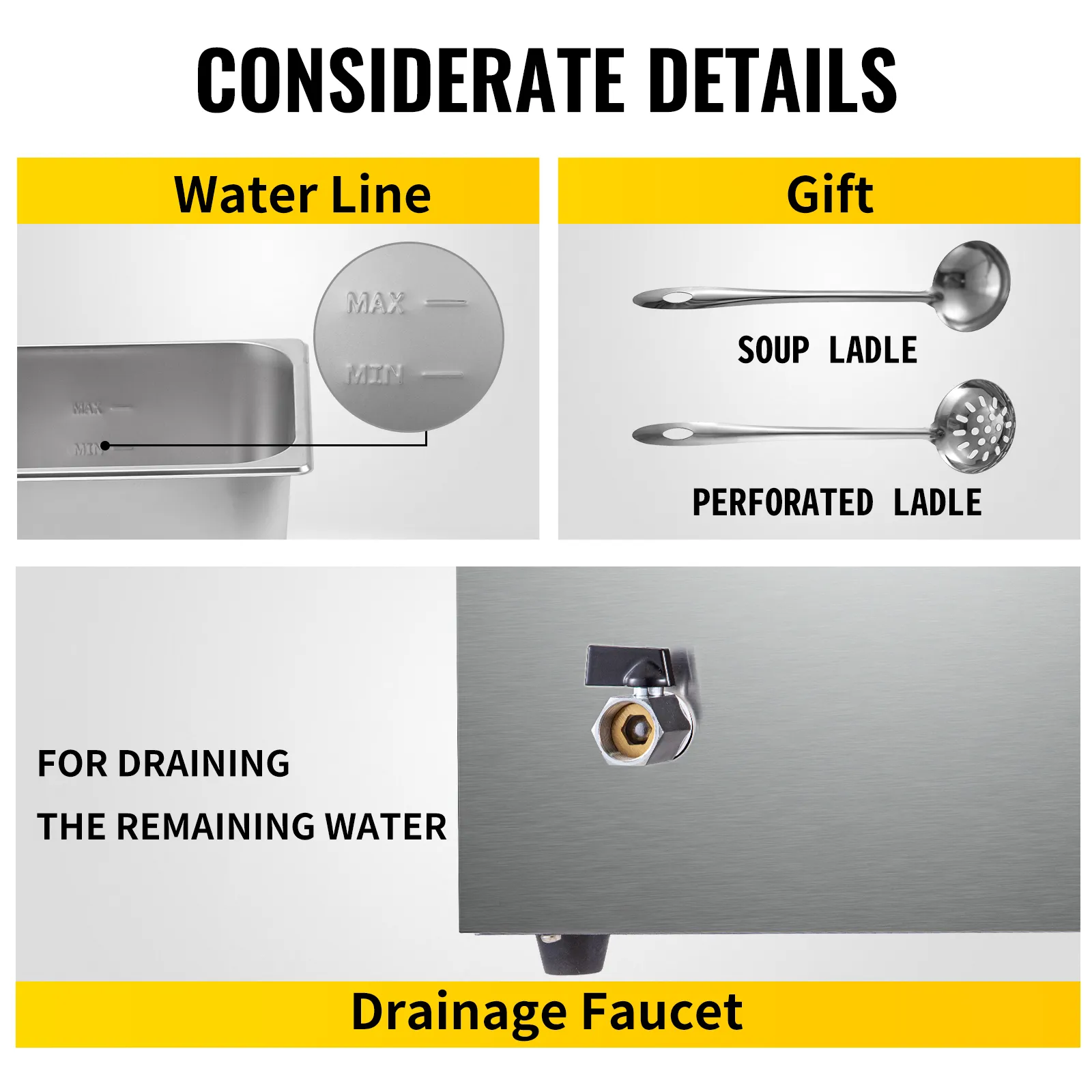 A faucet is attached to this commercial stainless steel bain marie for draining the remaining water for better maintenance. What’s more, two considerate water lines(Max. and Min.) supply reference to you.