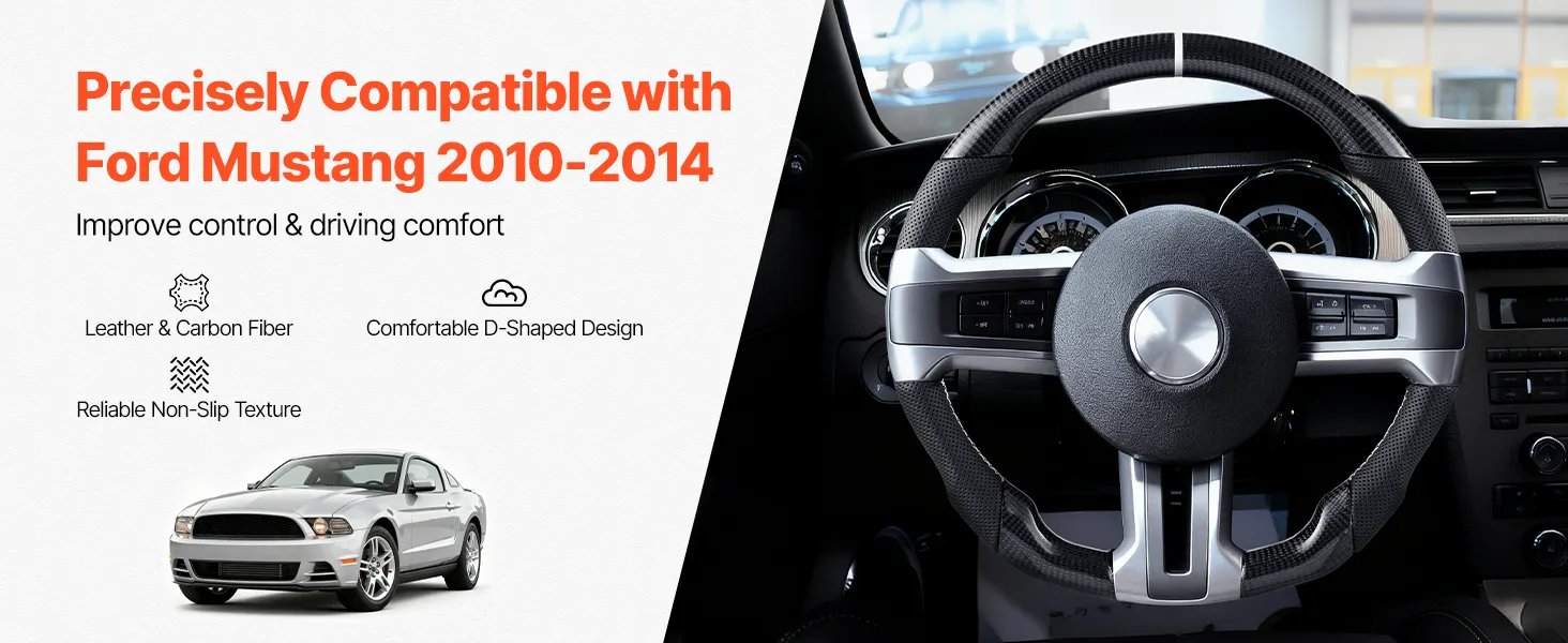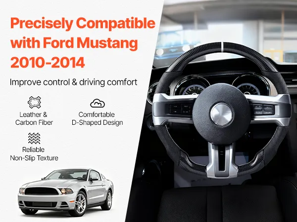 Designed for 2010-2014 Ford Mustang, this steering wheel precisely fits your vehicle and improves handling and driving comfort. Made of leather and carbon fiber, the D-shaped design with non-slip texture ensures confident and comfortable driving.