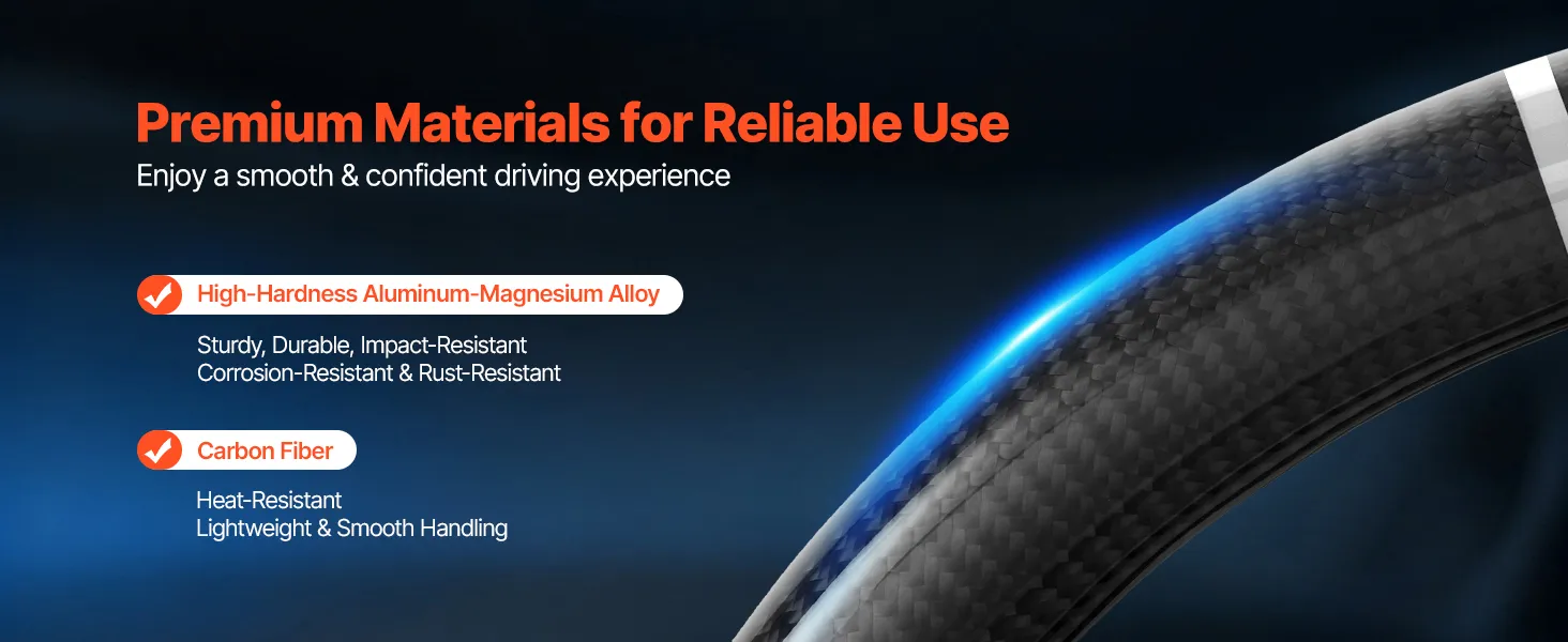 Our carbon fiber steering wheel is made of high-hardness aluminum-magnesium alloy, which is sturdy, durable, impact-resistant, and corrosion-resistant. The carbon fiber material is heat-resistant and lightweight, enhancing handling performance and making driving more reliable.