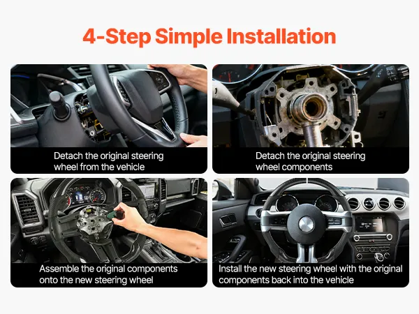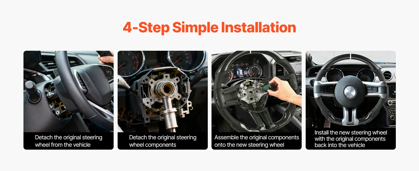 Install this flat-bottom steering wheel in four simple steps: 1) detach the stock wheel; 2) detach the OEM parts; 3) assemble the OEM parts on the new wheel; 4) mount the new wheel. No special skills required—upgrade in minutes.
