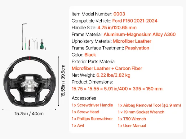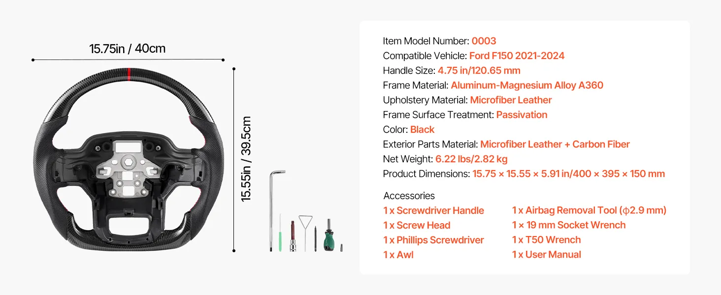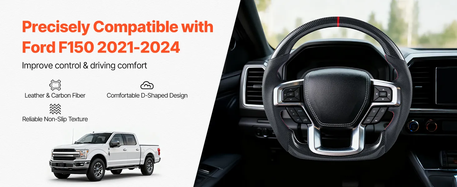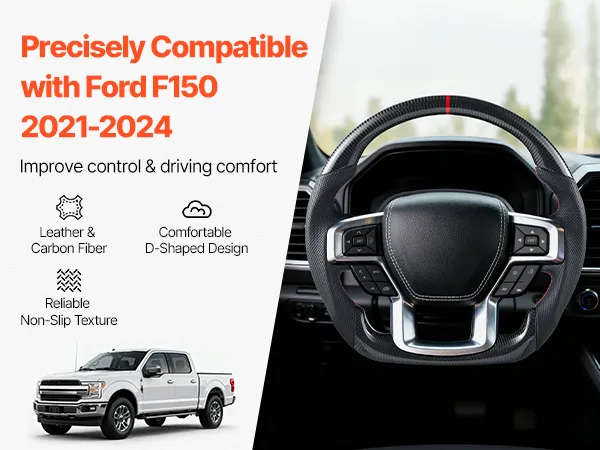 Designed for 2021-2024 Ford F150, this steering wheel precisely fits your vehicle and improves handling and driving comfort. Made of leather and carbon fiber, the D-shaped design with non-slip texture ensures confident and comfortable driving.
