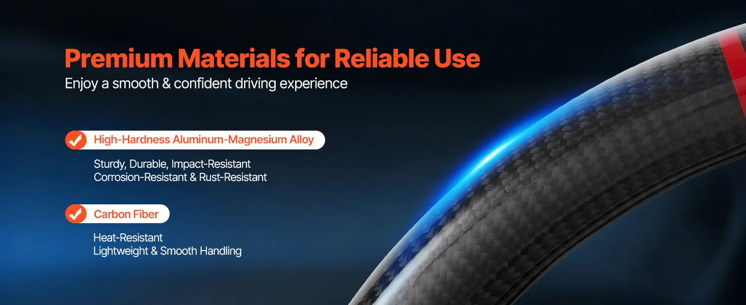 Our carbon fiber steering wheel is made of high-hardness aluminum-magnesium alloy, which is sturdy, durable, impact-resistant, and corrosion-resistant. The carbon fiber material is heat-resistant and lightweight, enhancing handling performance and making driving more reliable.