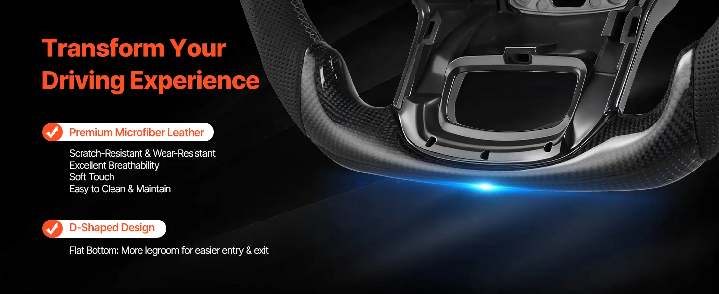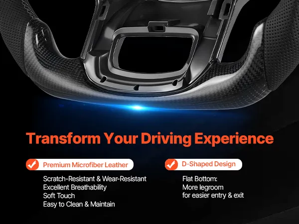 Transform your driving experience. This real carbon fiber steering wheel features breathable microfiber leather that provides a soft touch, wear and scratch resistance, and is easy to clean and maintain. Its D-shaped design increases legroom, making getting in and out of the car convenient.
