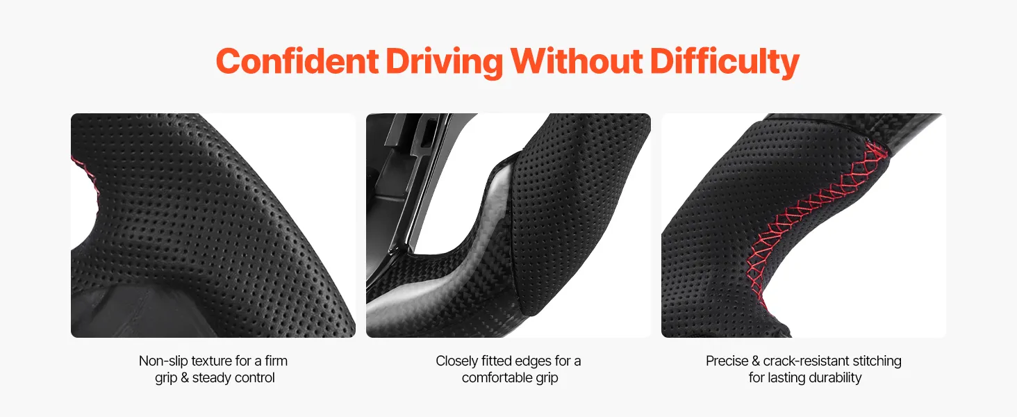 Our steering wheel replacement allows you to drive confidently. The non-slip texture enables easy and firm grip, avoiding slippage while driving; the tightly fitted edges ensure a comfortable grip; the precise stitching withstands cracking, ensuring long-term durability.