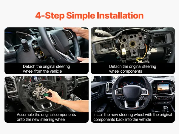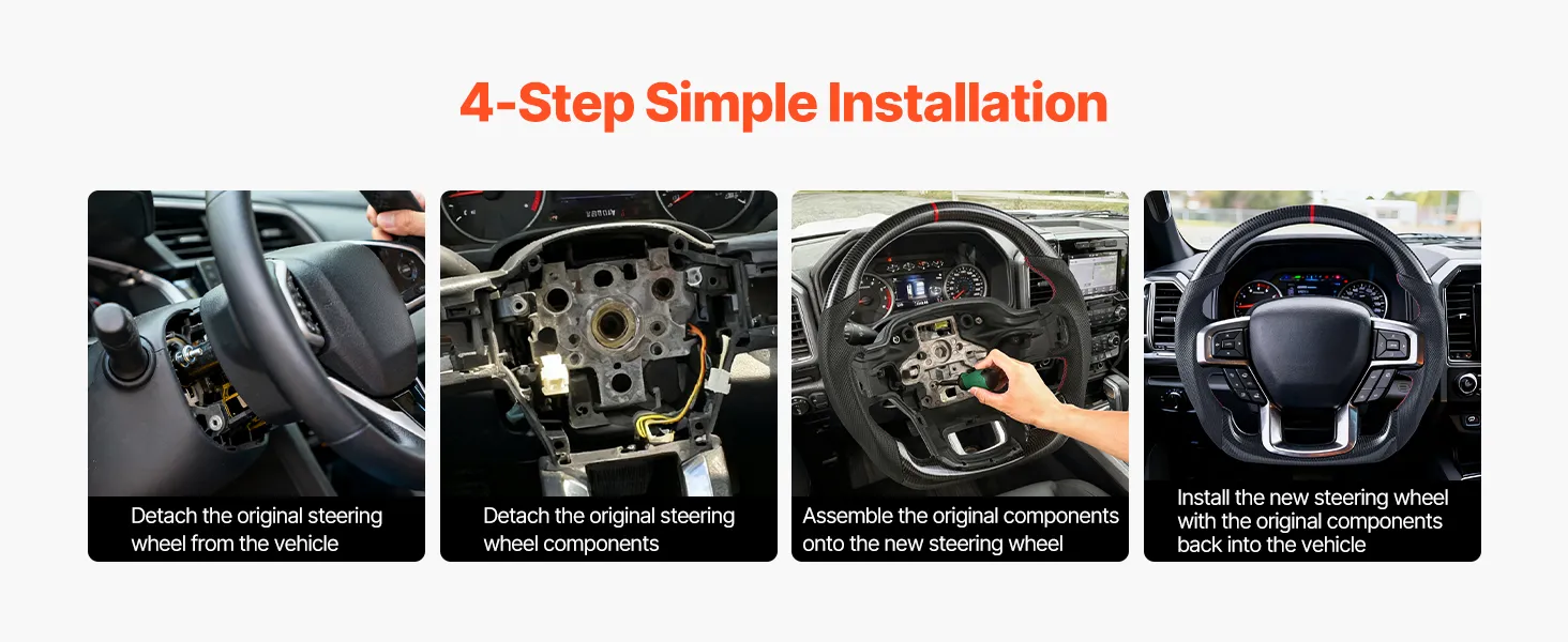 Install this flat-bottom steering wheel in four simple steps: 1) detach the stock wheel; 2) detach the OEM parts; 3) assemble the OEM parts on the new wheel; 4) mount the new wheel. No special skills required—upgrade in minutes.