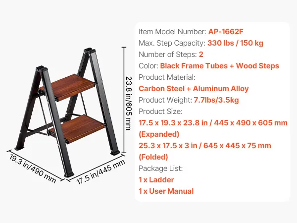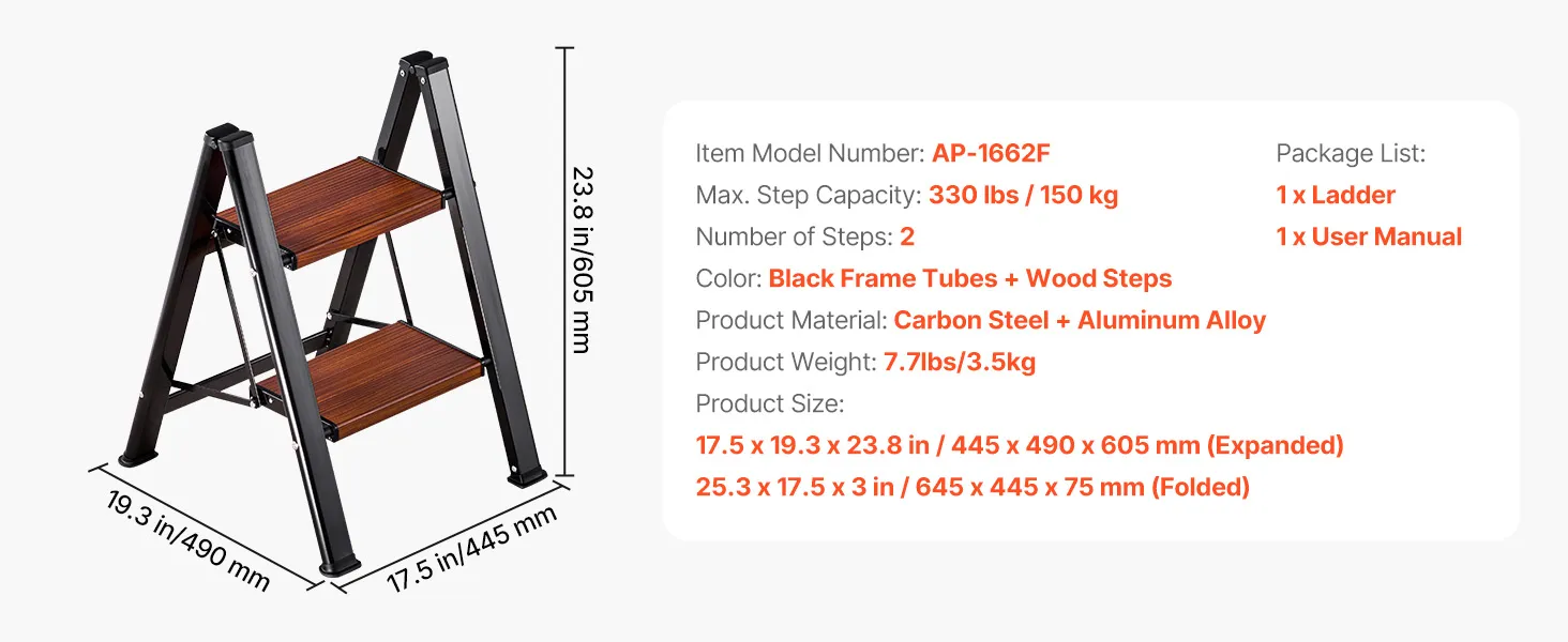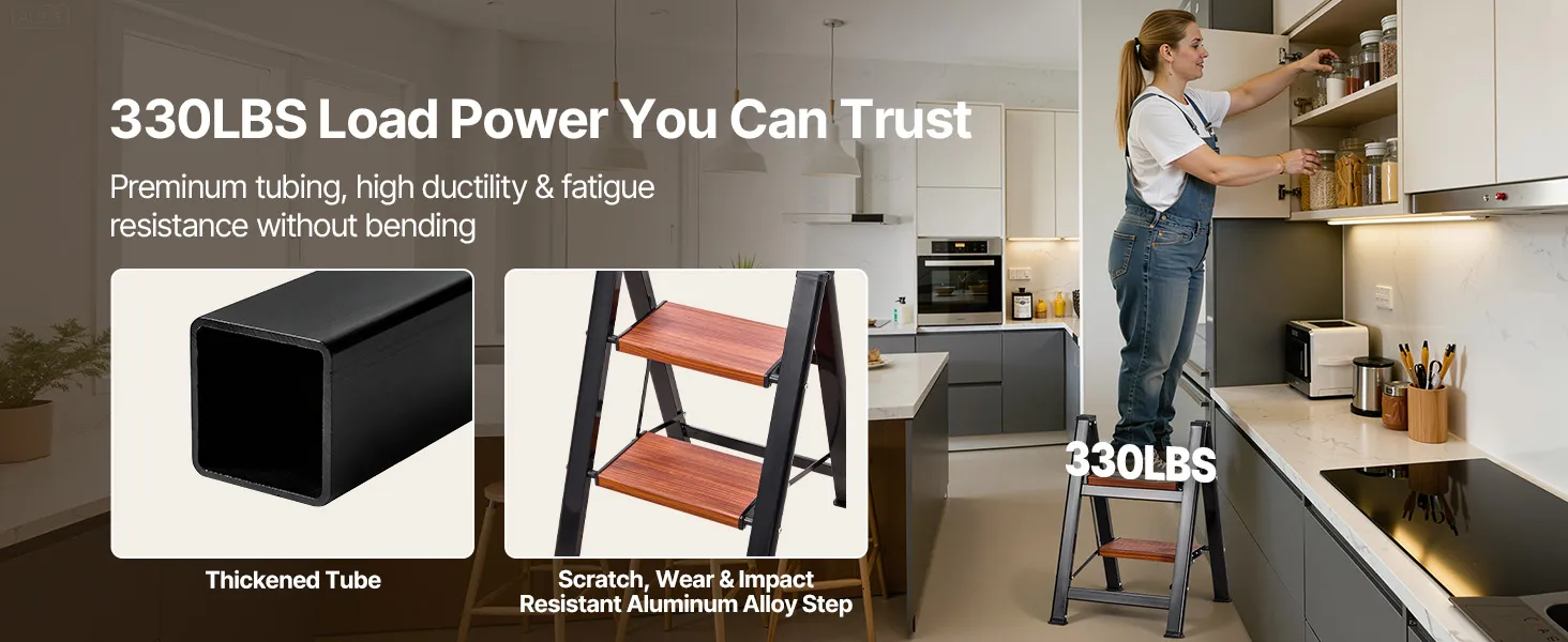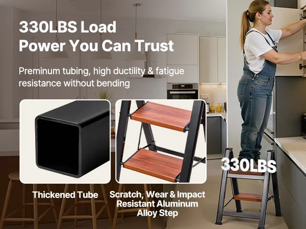 330 lbs Load Capacity: Built from thick superb carbon steel tubing and excellent heat transfer wood textured aluminum step with rust- and damp-resistant, the folding step ladder delivers rock-solid 330 lbs max. support, lasting stability over time