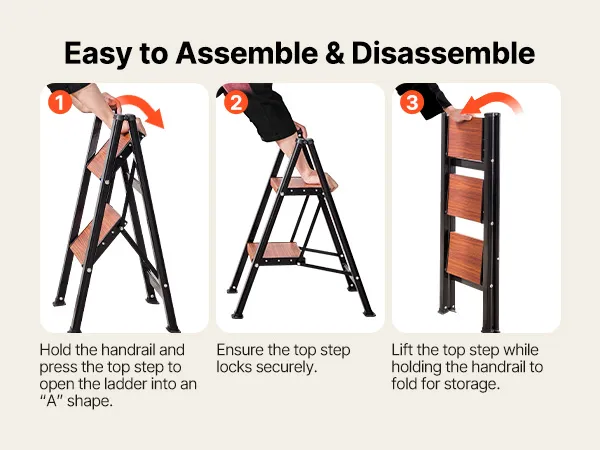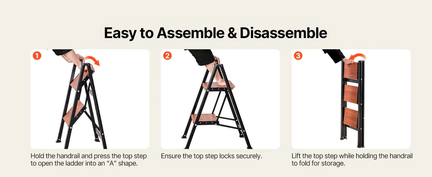 This foldable step ladder opens easily with a one-hand press-to-lock top step with smooth and hassle-free operation, no complicated setup, folds slim for storage when not in use, great for everyday homes.