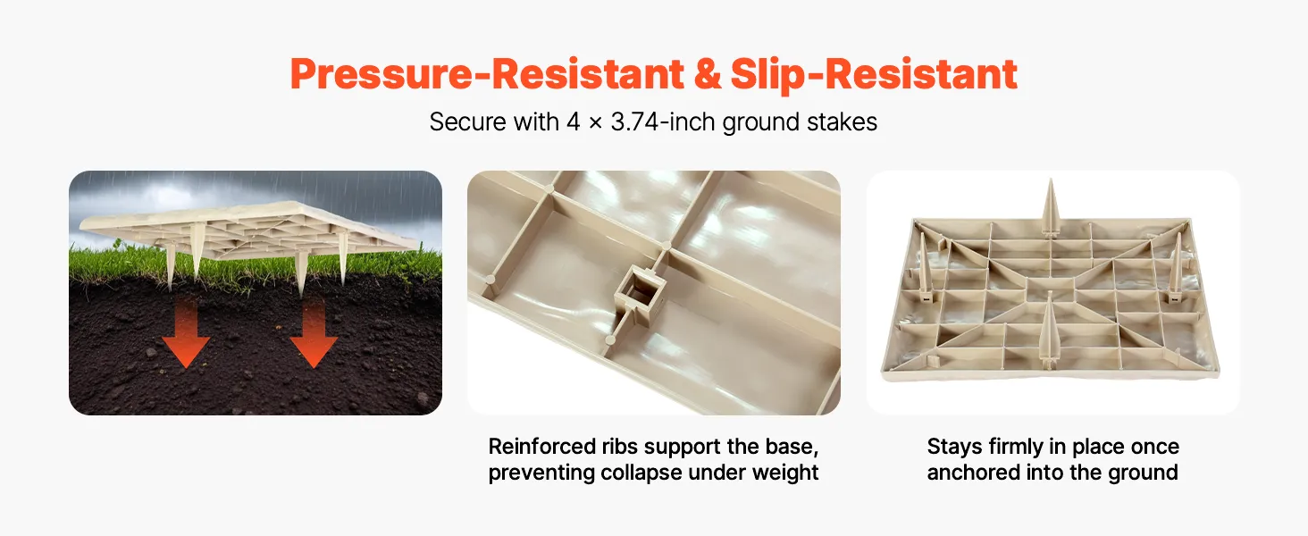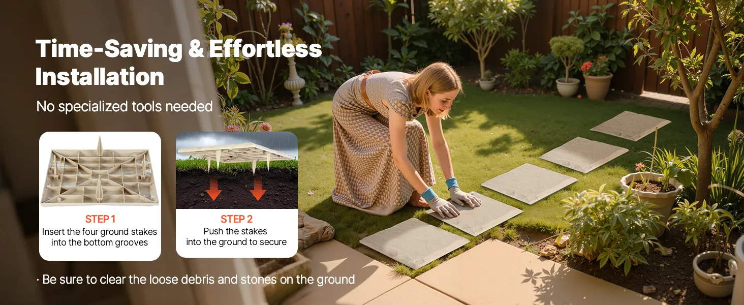 Secure & Stable: Each pathway stepping stone includes four 3.74-inch (95 mm) ground stakes and a reinforced ribbed base for enhanced stability. They stay firmly in place even in heavy rain or with frequent foot traffic—ideal for homes with kids and pets.