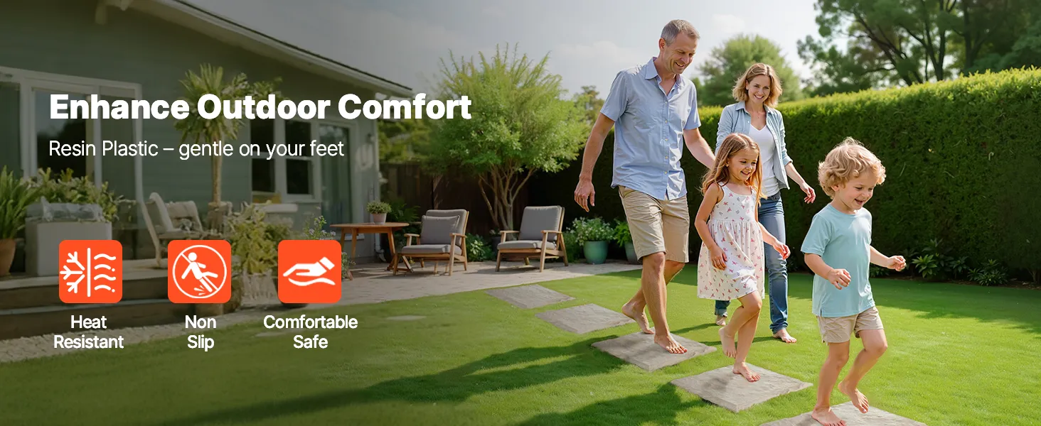 The raised textured surface provides slip resistance and stays cool underfoot—ideal for barefoot summer walks. Smooth, rounded edges ensure safety for kids and pets, offering a comfortable and family-friendly path experience.