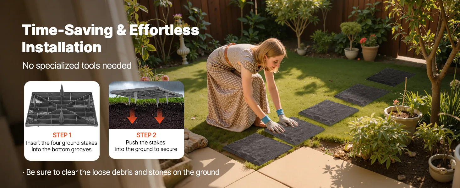 No tools required—simply insert four ground stakes into the slots underneath each stone. Easy enough for one person to install, making it ideal for DIY enthusiasts and first-time gardeners alike.