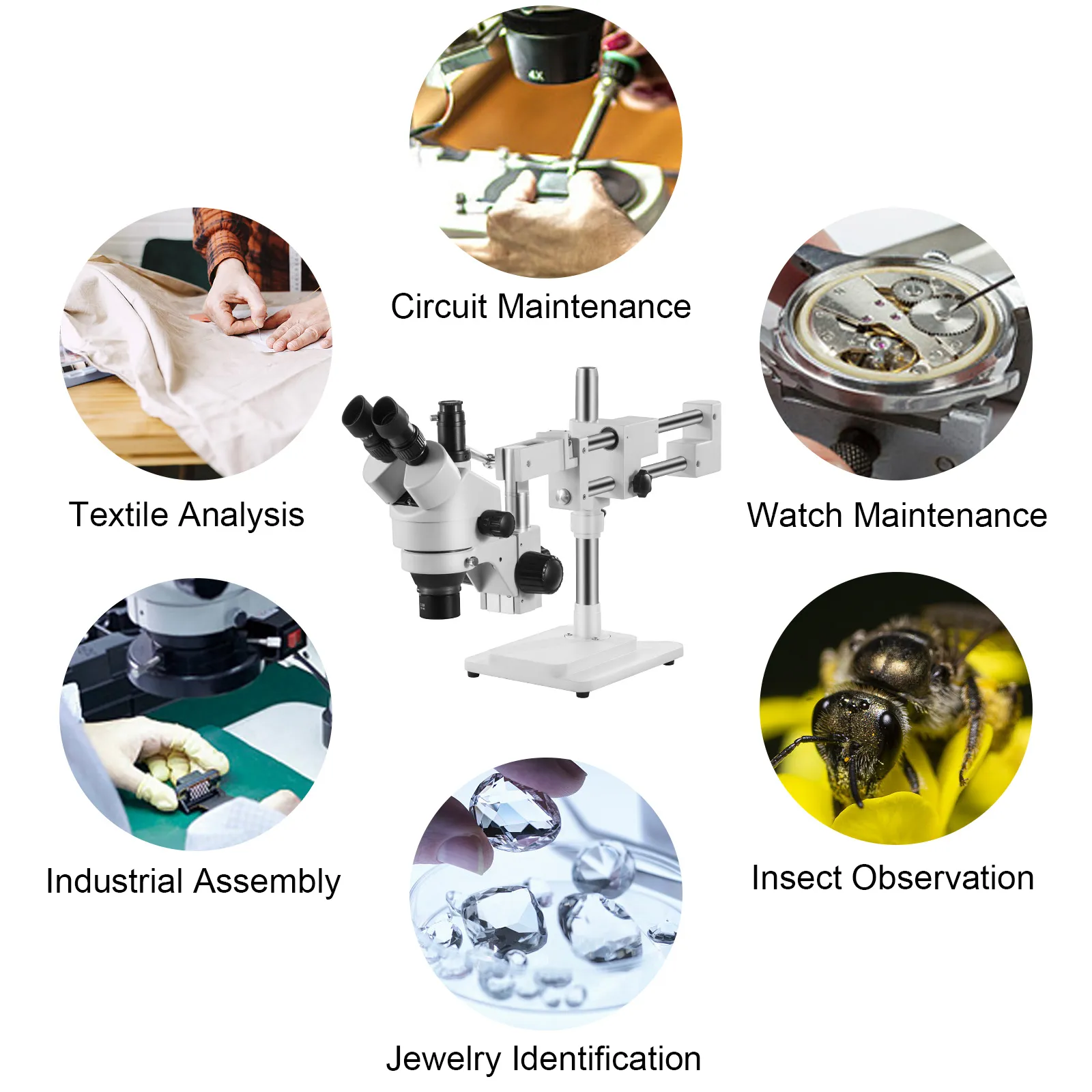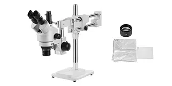 This stereo boom microscope is widely used for the electric industry, insect observation, scientific research, jewelry identification, and textile industry.