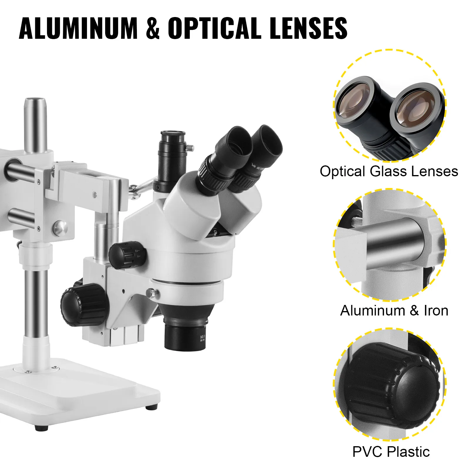 The stereo microscope is made of sturdy aluminum and iron with high strength and premium optical glass lenses to provide a high-resolution image.