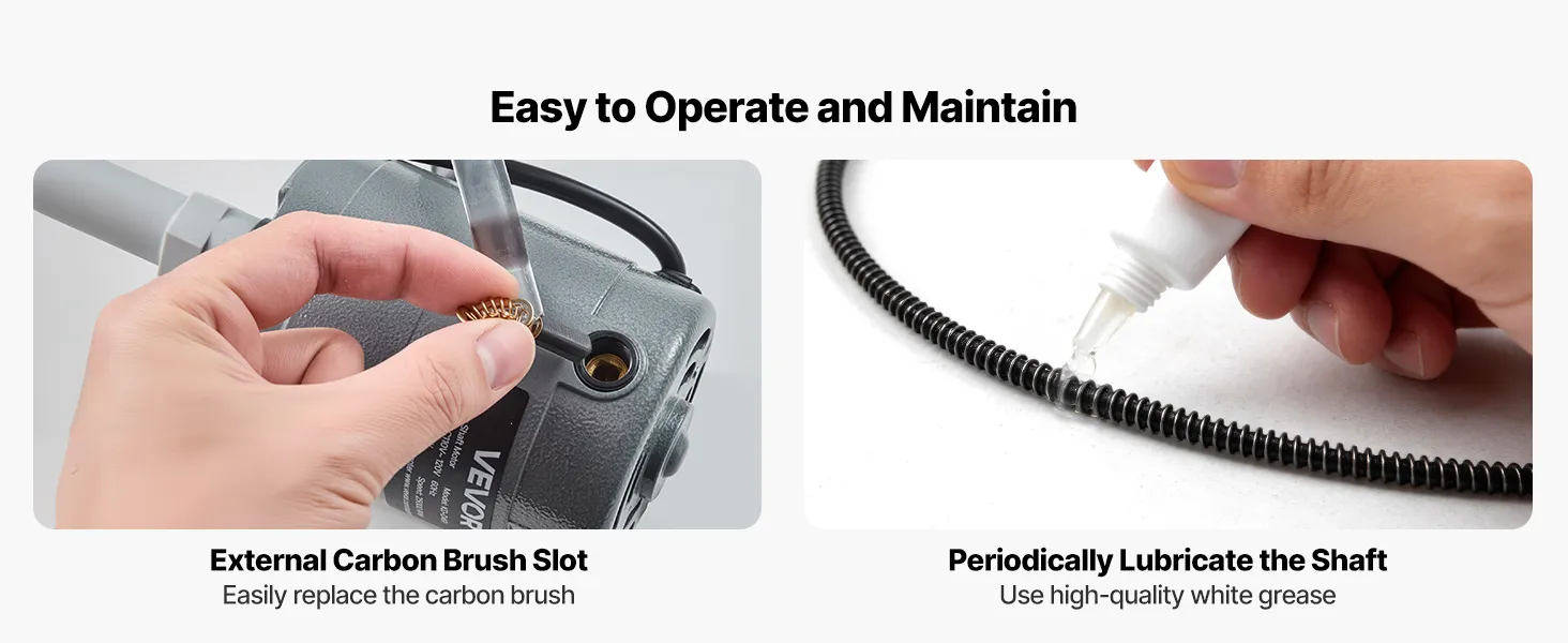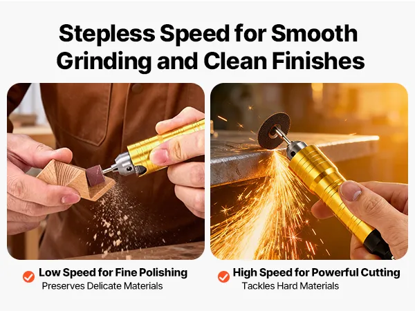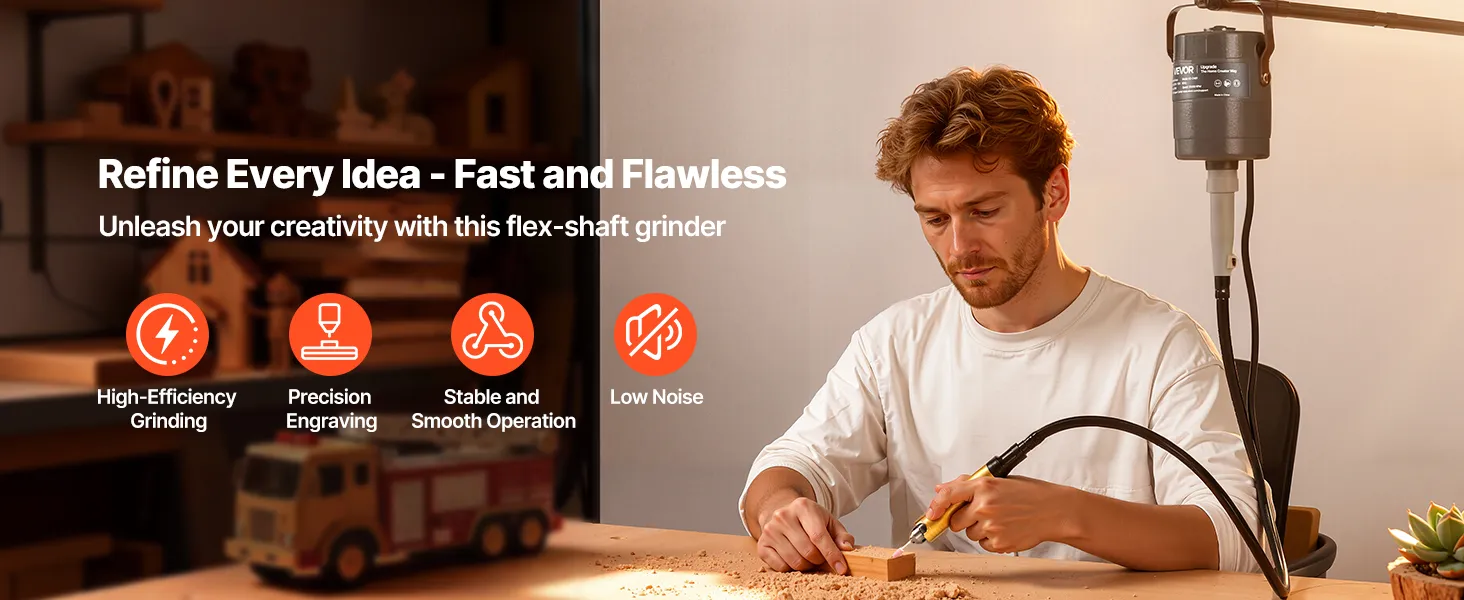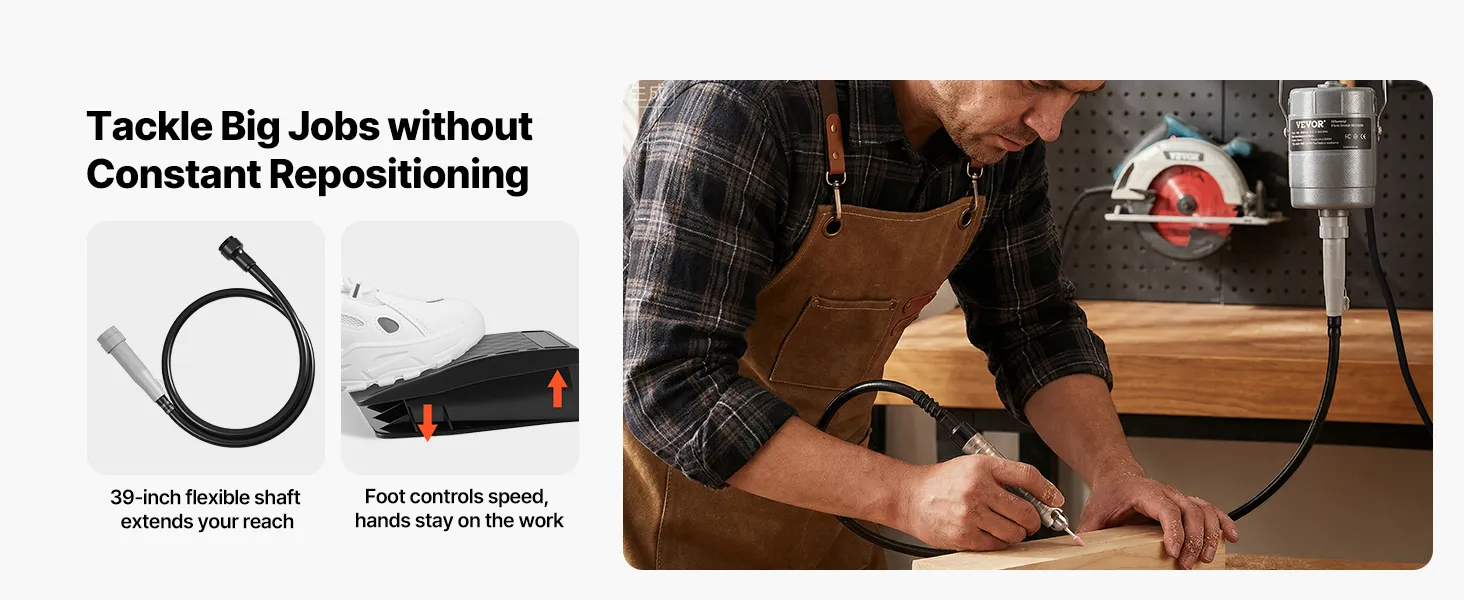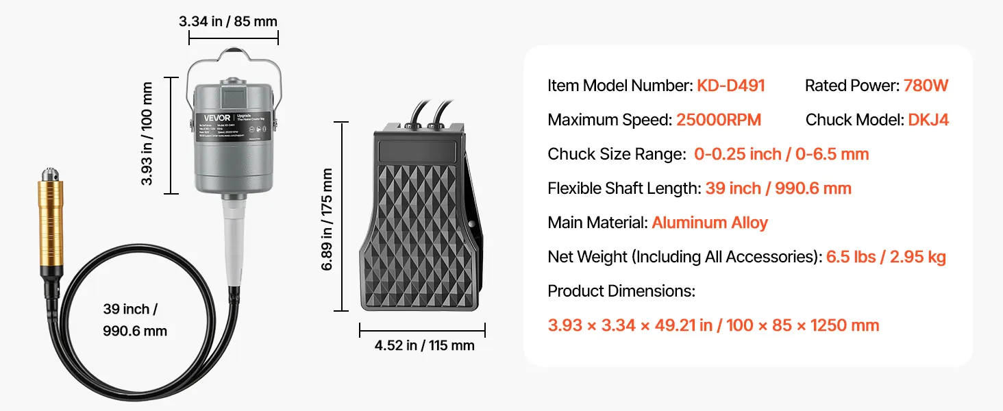 Strong Motor Output: Powered by a 780W copper motor with speeds up to 25000 RPM, VEVOR flex shaft grinder delivers smooth, efficient performance, handling sanding, grinding, cutting, and polishing tasks with precision and speed