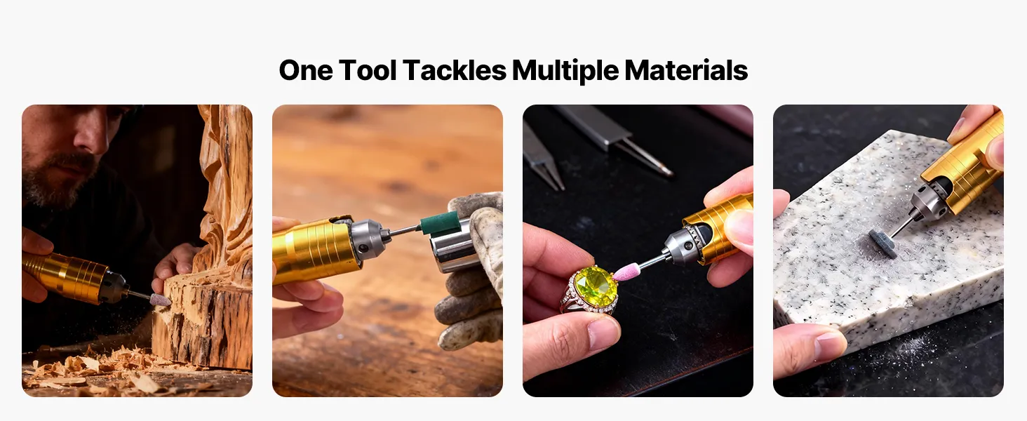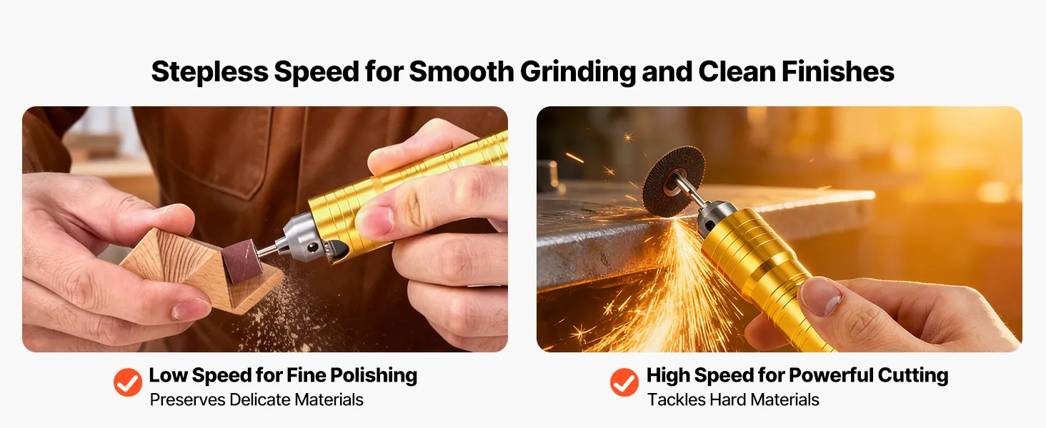 Multi-Functional Use: Ideal for precision work on multiple materials, this electric flex shaft grinder suits both professionals and DIY users. Easily handle wood sanding, metal polishing, jewelry drilling, and stone grinding with efficiency and control