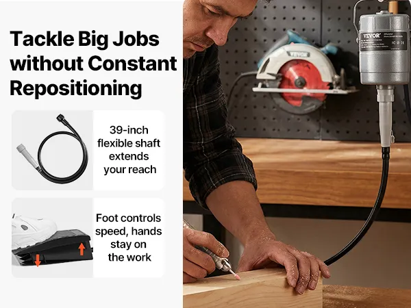 High-Precision Chuck: Featuring a 3-jaw chuck with a 0–6.5 mm (0–0.25 in) clamping range, this flex shaft rotary tool securely holds accessories without slipping. Paired with a 39-inch extended flexible shaft for improved reach and control