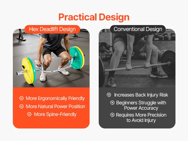 Humanized Design: Ergonomic knurled handles with a fine non-slip texture give you a secure, comfortable grip during squats, deadlifts, shrugs, and carries. The hex shape guides your lifting posture and is easier on your lower back