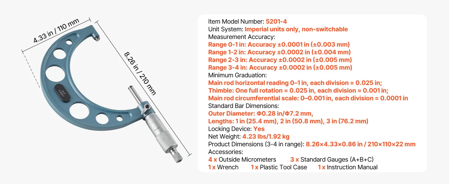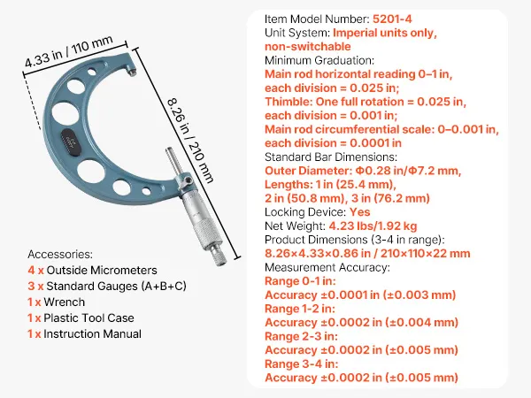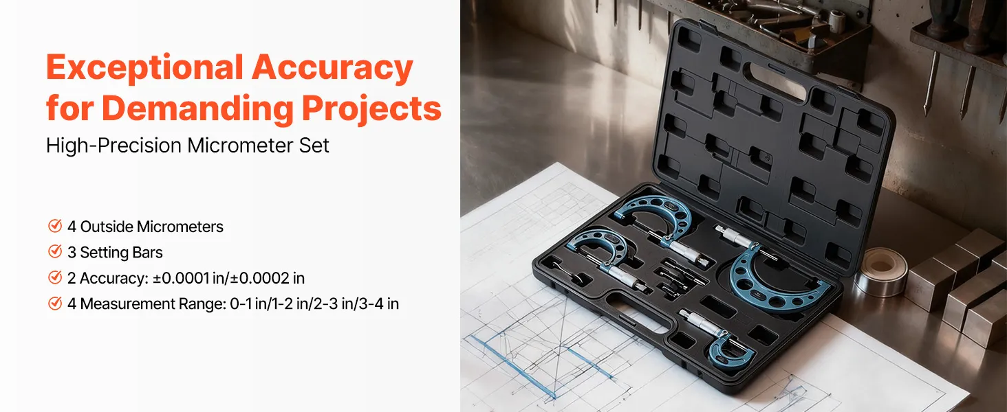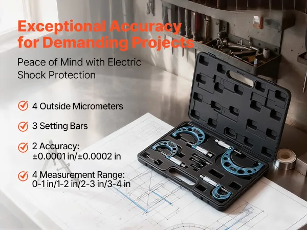 High-Precision Micrometer Set: This micrometer offers ±0.0001 in and ±0.0002 in accuracy, with four micrometers Caping 0-4 in and three calibration rods for verification. Ideal for measuring engine parts or precision components with consistent results