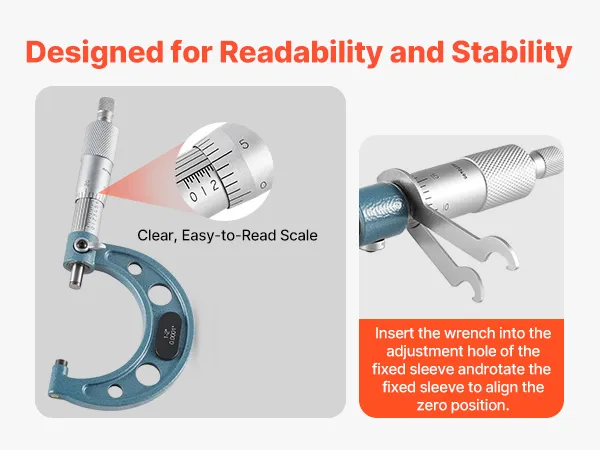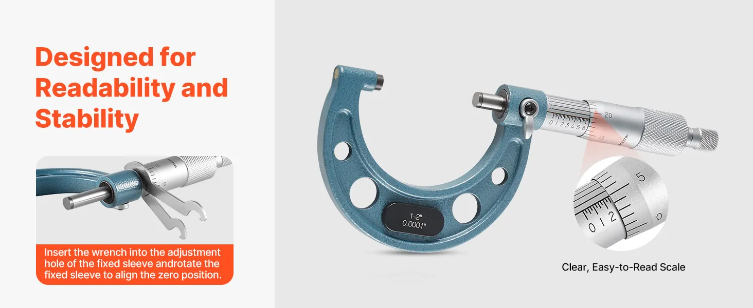 Easy-to-Read & Intuitive Operation: This micrometer set features clear sleeve markings and a zero-adjust wrench, making dynamic adjustments simple. The smooth spindle ensures easy sliding for quick part positioning, maintaining measurement accuracy