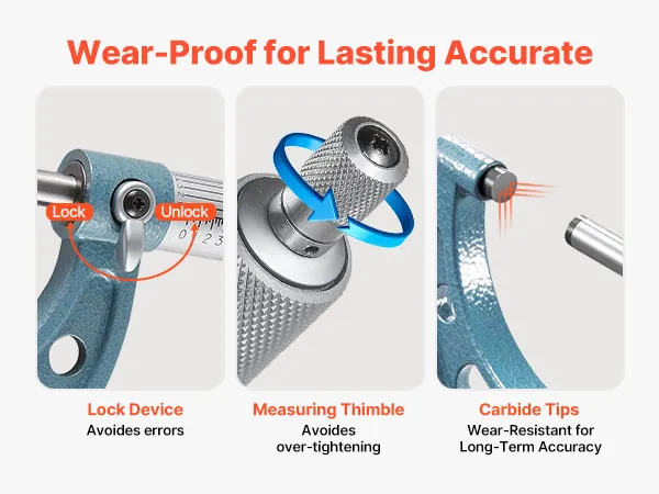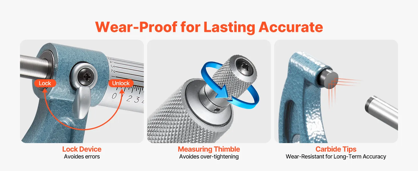 Precise Performance: Built with a carbide-tipped measuring face, this digital micrometer ensures long-lasting accuracy and wear-resistance. The lock nut avoids slippage, while the ratchet thimble offers smooth control and stable precision over time