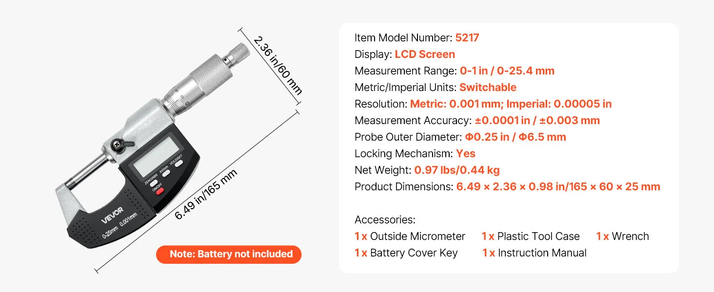 Complete Set Included: This micrometer digital includes a dedicated hard case with 1 micrometer, wrench, battery Cap key, and instructions. Keeps tools organized, easy to carry, and ready for accurate measurements anytime