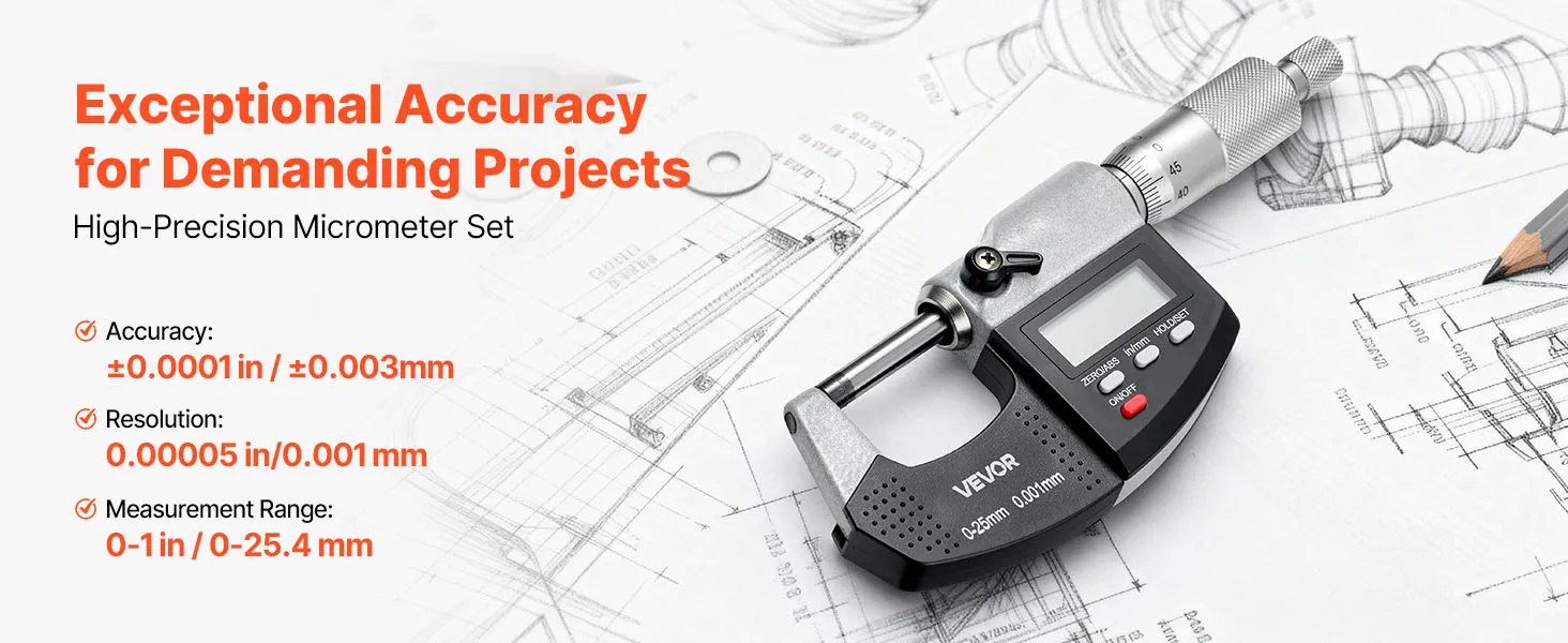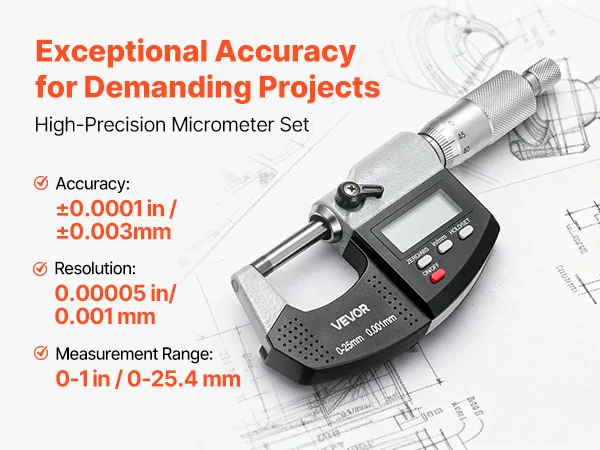 High-Precision Micrometer Set: Offers 0-1 in / 0-25.4 mm range, ±0.0001 in / ±0.003 mm accuracy, and 0.00005 in / 0.001 mm resolution. Whether checking engine parts or fine components, this micrometer ensures consistent, reliable measurements every time