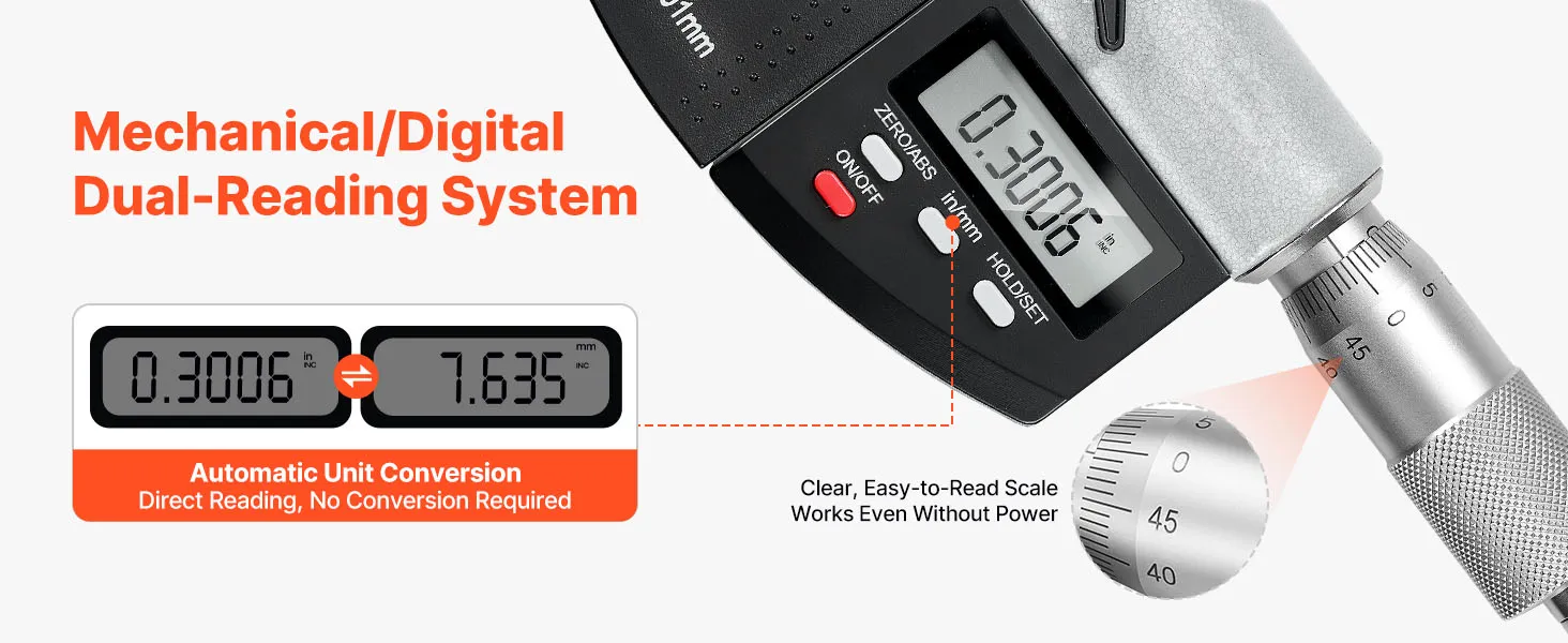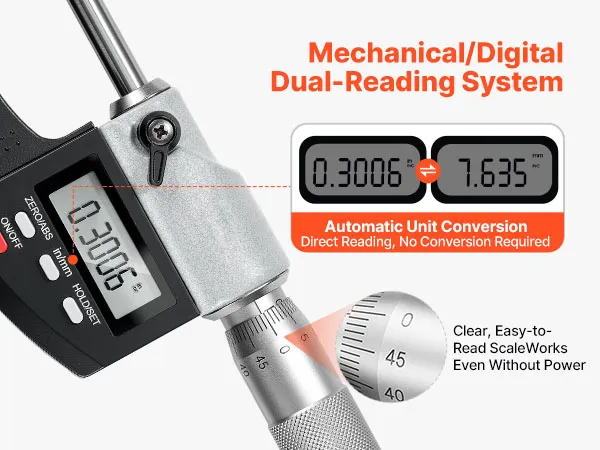This micrometer allows easy reading via LCD with one-button imperial/metric switching for accurate measurements, while also supporting clear mechanical scale readings, ensuring reliable use even if the battery is depleted.