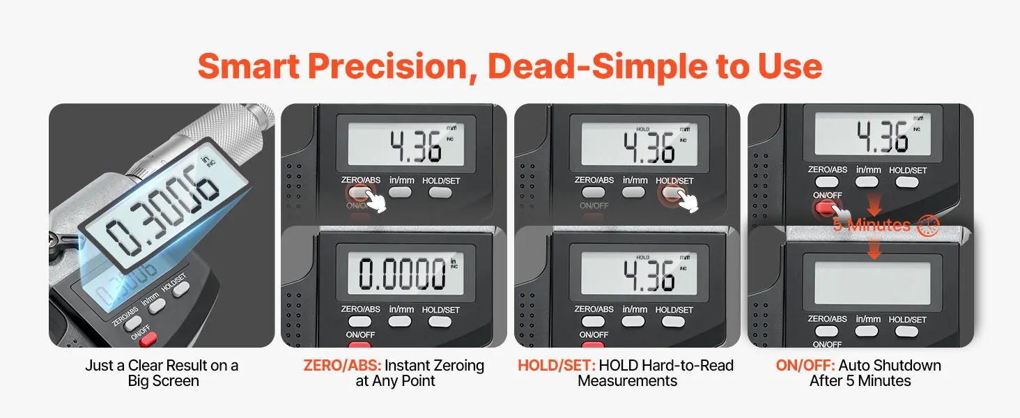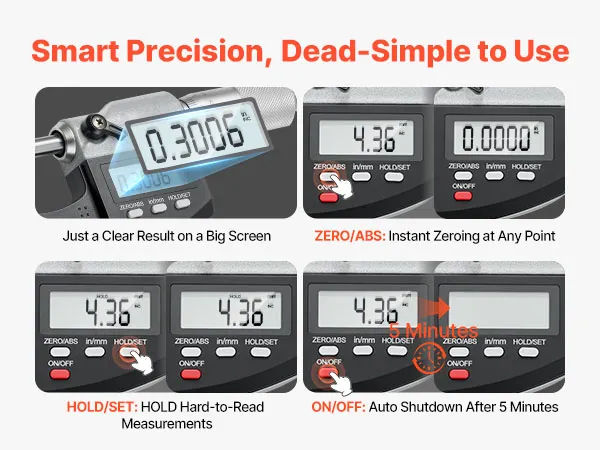 Smart & Easy Operation: This micrometer set features a large LCD for clear readings, quick inch/mm switch, and data hold to lock values in tight spots. A 5-minute auto-off function avoids power waste, making precision measurement easier
