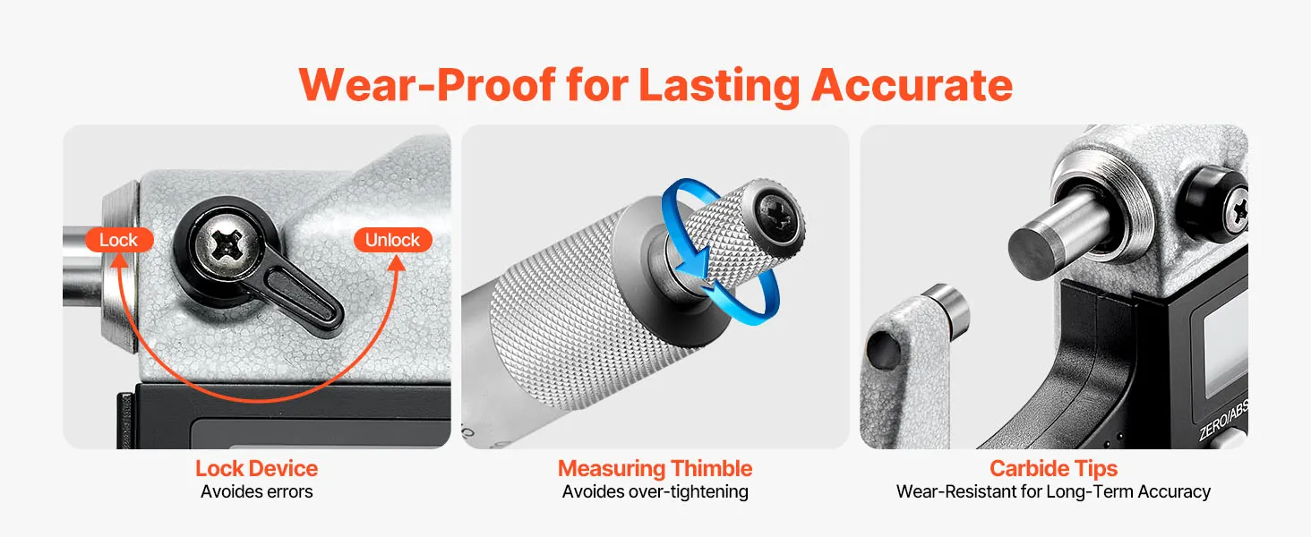 Precise Performance: Built with a carbide-tipped measuring face, this digital micrometer ensures long-lasting accuracy and wear-resistance. The lock nut avoids slippage, while the ratchet thimble offers smooth control and stable precision over time