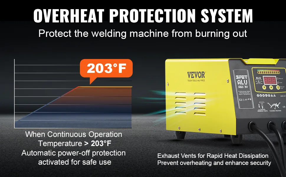 Our spot welding machine is equipped with an intelligent overheat protection system, which activates when the temperature exceeds 203℉, preventing short circuits and machine damage. Tthe side vents also ensure rapid heat dissipation, making welding hassle-free and secure.