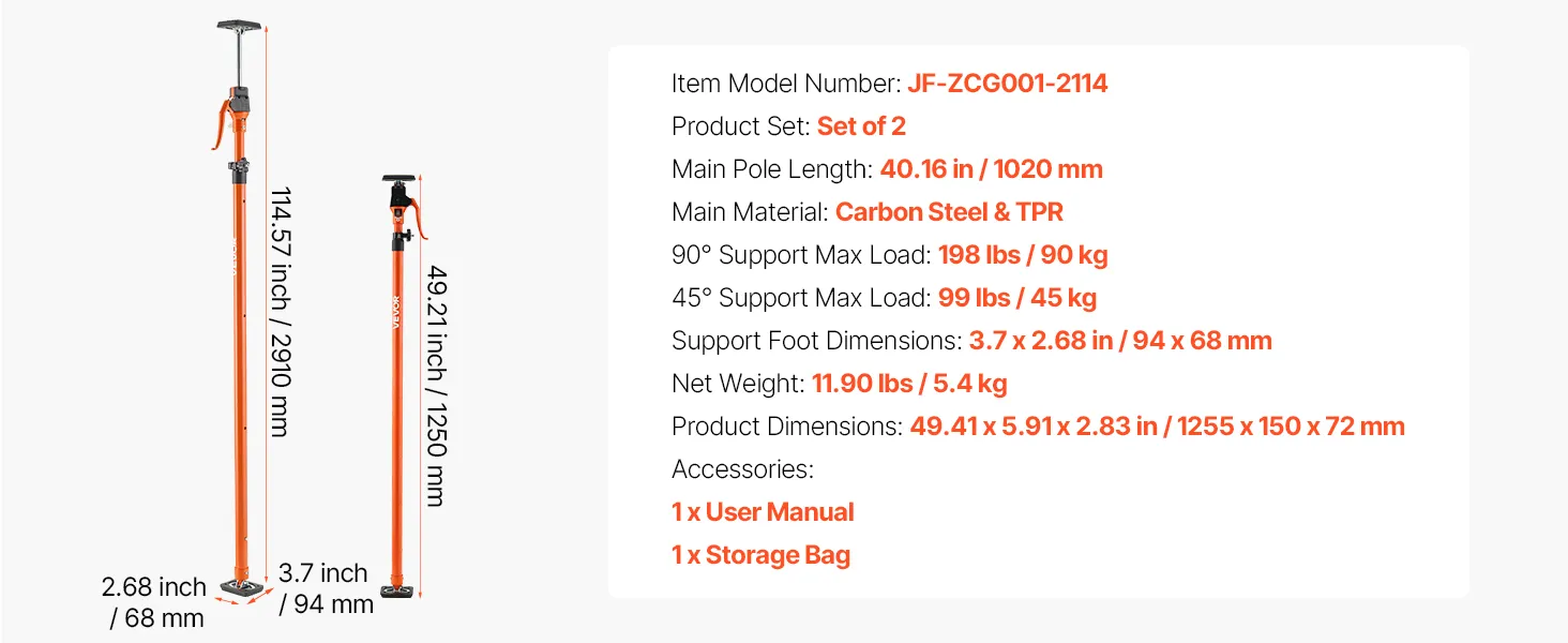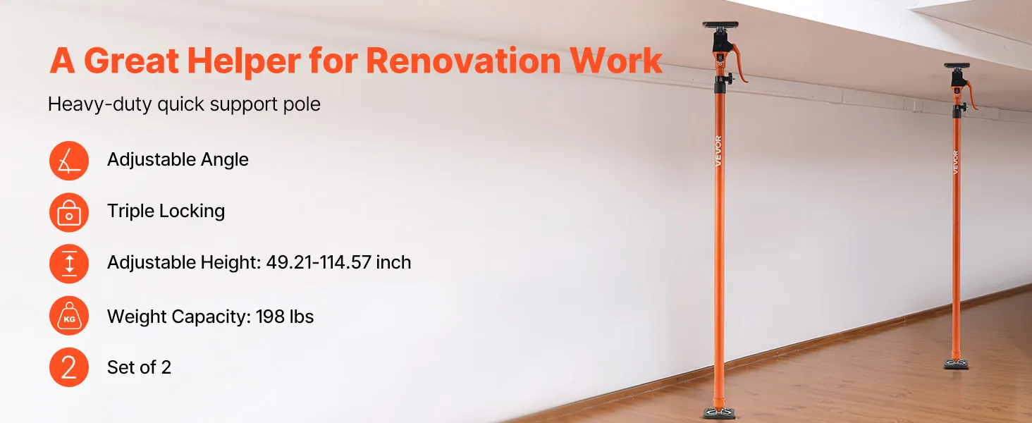 Strong 198 lbs Load Capacity: Each telescoping support pole holds up to 198 lbs, providing steady support for drywall, shelving, or woodworking. Ideal for construction sites, temporary bracing, or home renovation