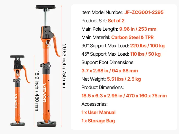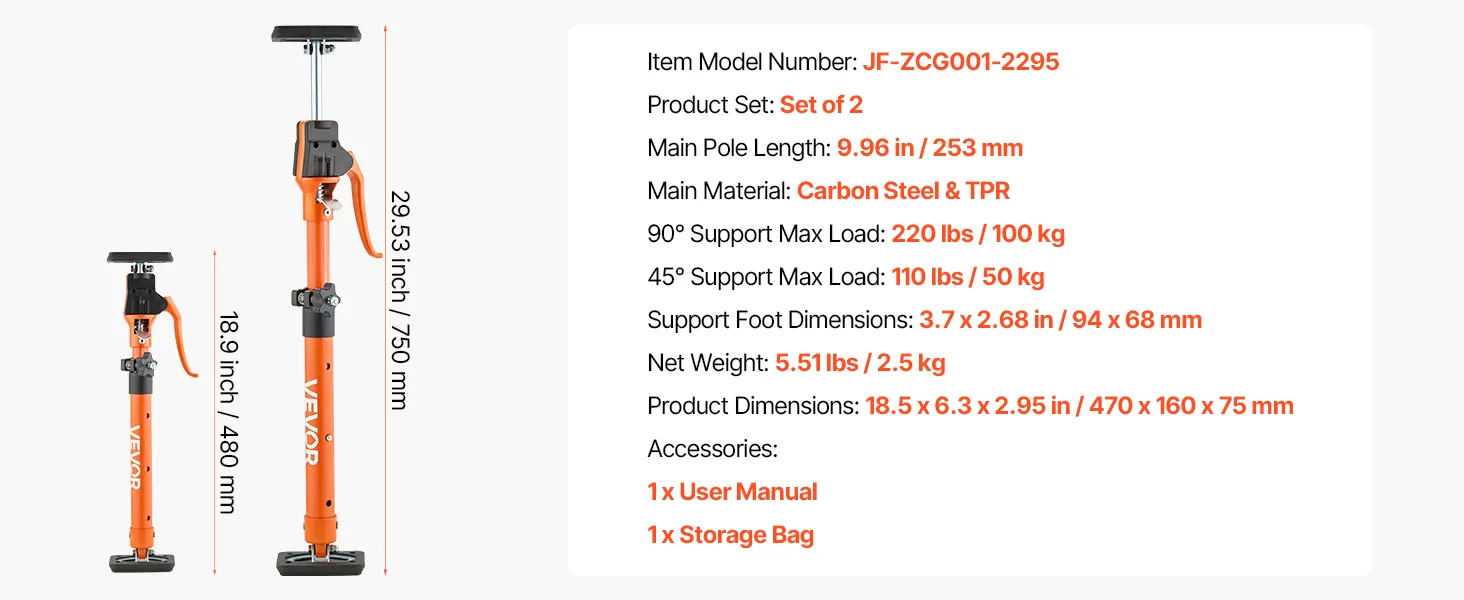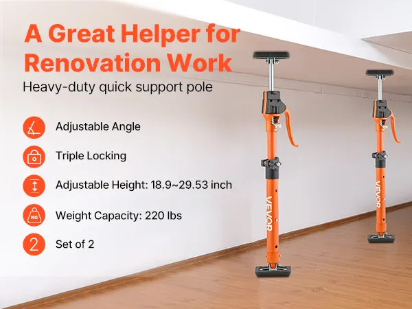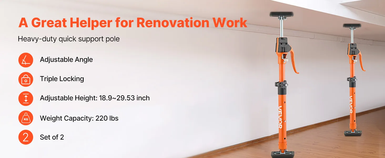 This 2-pack cabinet jack support pole set delivers efficient load support for jobsites, warehouses, and home projects. With a 220 lbs load capacity, adjustable height, and secure lock-in design, it's ideal for lifting or holding cabinets, drywall, and more.