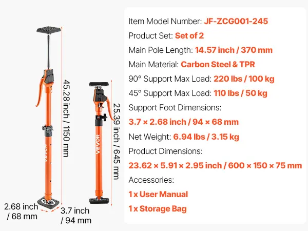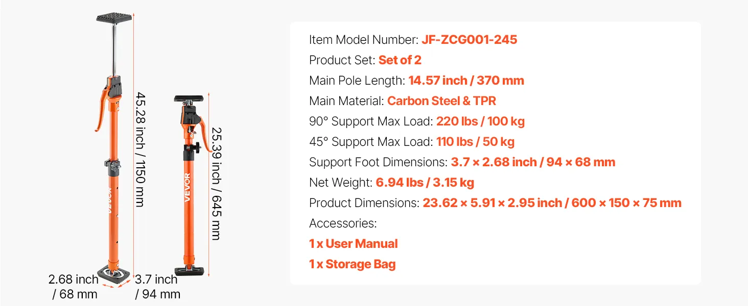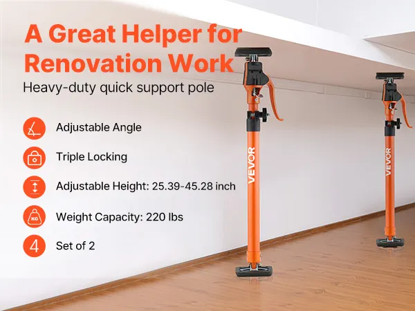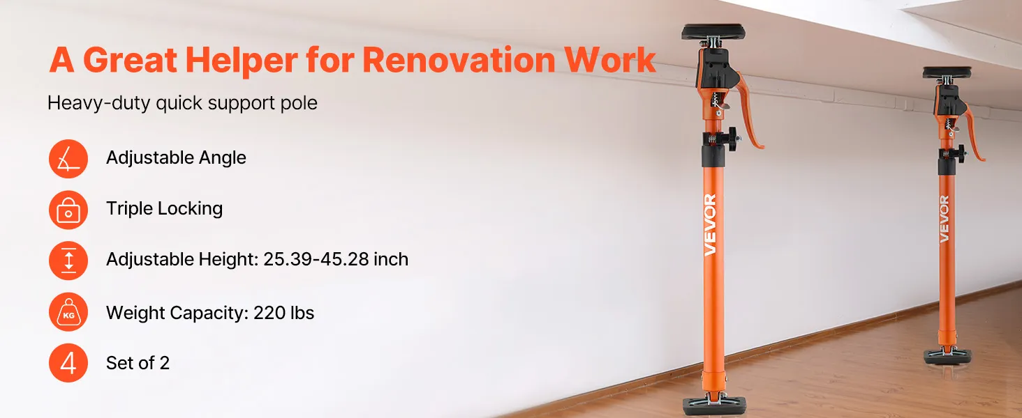 This 2-pack cabinet jack support pole set delivers efficient load support for jobsites, warehouses, and home projects. With a 220 lbs load capacity, adjustable height, and secure lock-in design, it's ideal for lifting or holding cabinets, drywall, and more.