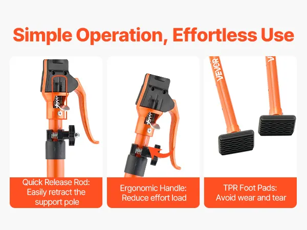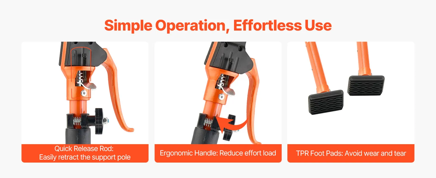 Secure & Easy to Use: Assembles in minutes with the included manual. Triple-lock system of the cabinet jack avoids slipping under load. Features a comfy grip handle, non-slip foam, quick-release rod, and anti-slip top plate