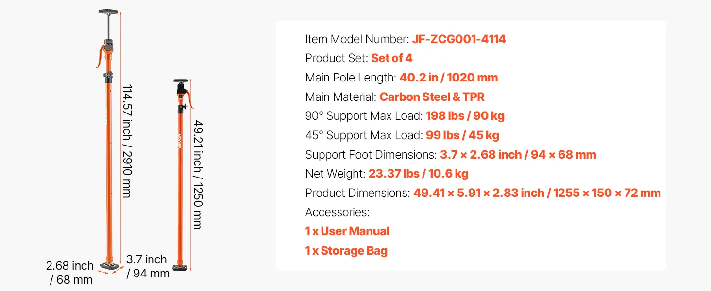 Strong 198 lbs Load Capacity: Each telescoping support pole holds up to 198 lbs, providing steady support for drywall, shelving, or woodworking. Ideal for construction sites, temporary bracing, or home renovation