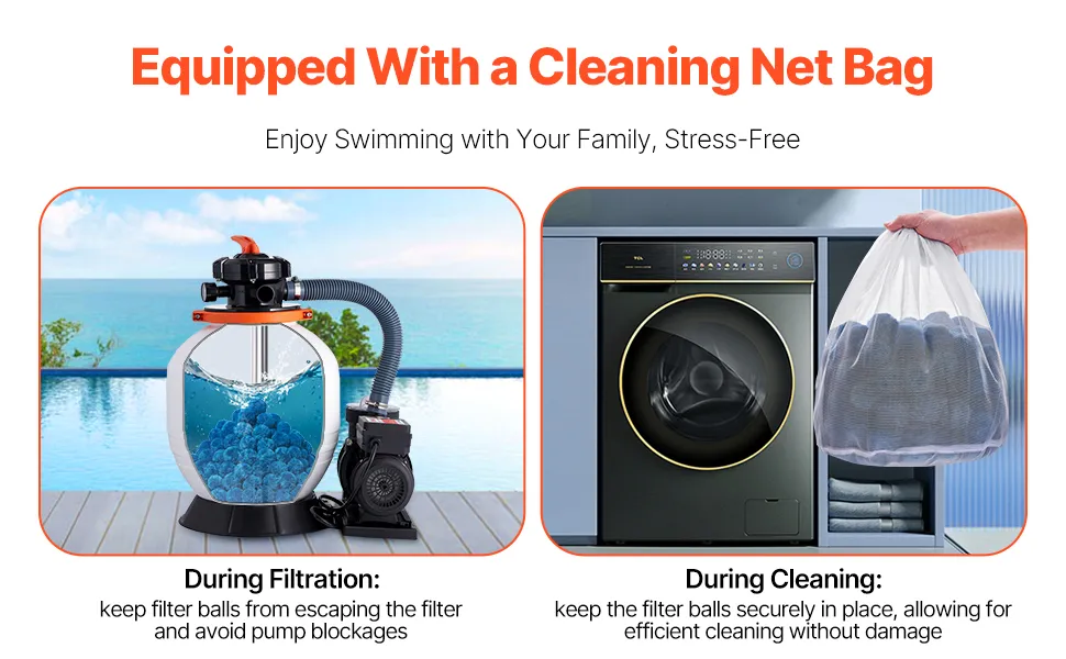 The filter balls for swimming pools come with a cleaning mesh bag, designed to be used with the filter balls, avoiding any clogging in your filtration system. No need to worry about blockages, just hassle-free filtration and maintenance.