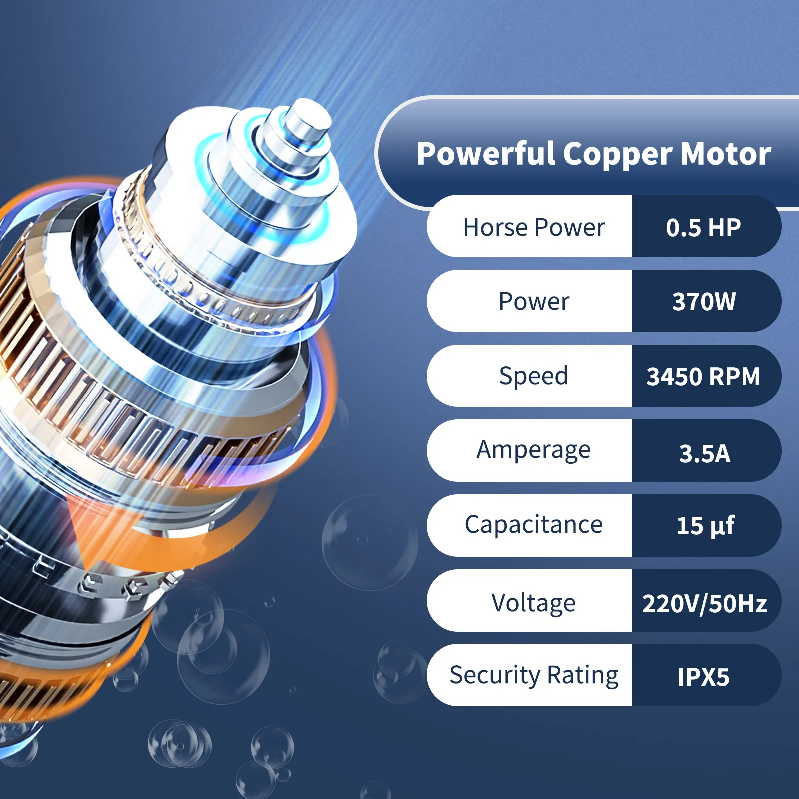 Power: 370W/0.5 HP, Amps: 3.5A, Capacitor: 15µf. The pool pump is equipped with a pure copper motor to achieve high efficiency and a long service time.