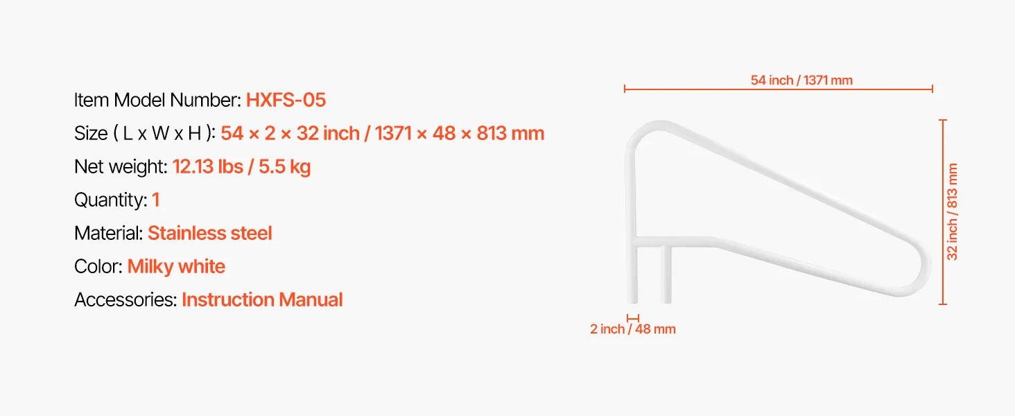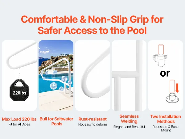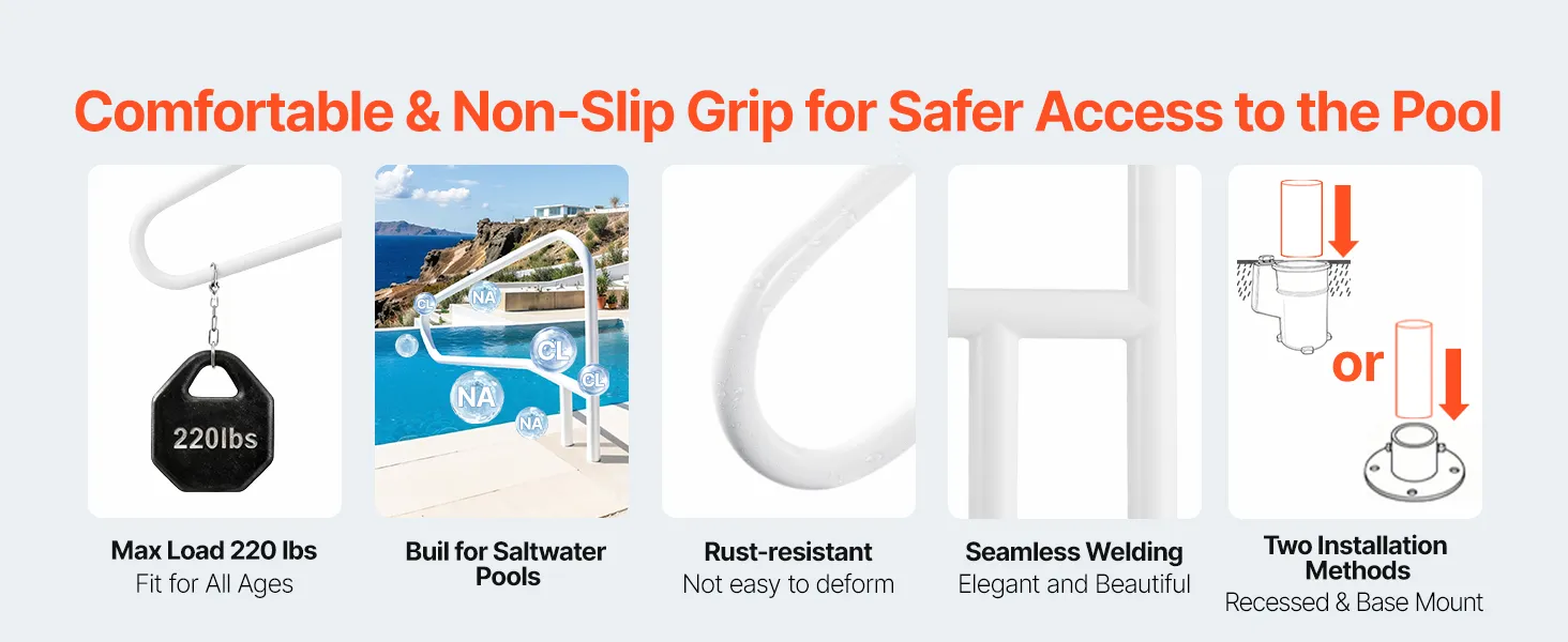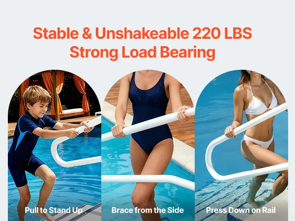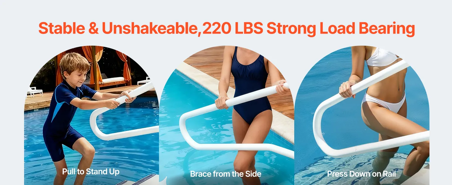 220 lbs Heavy-Duty Load: Our pool handrail ensures security entry and exit from your pool. Whether pulling up, supporting from the side, or pressing down vertically, the swimming pool rail distributes weight evenly, resisting breakage or deformation